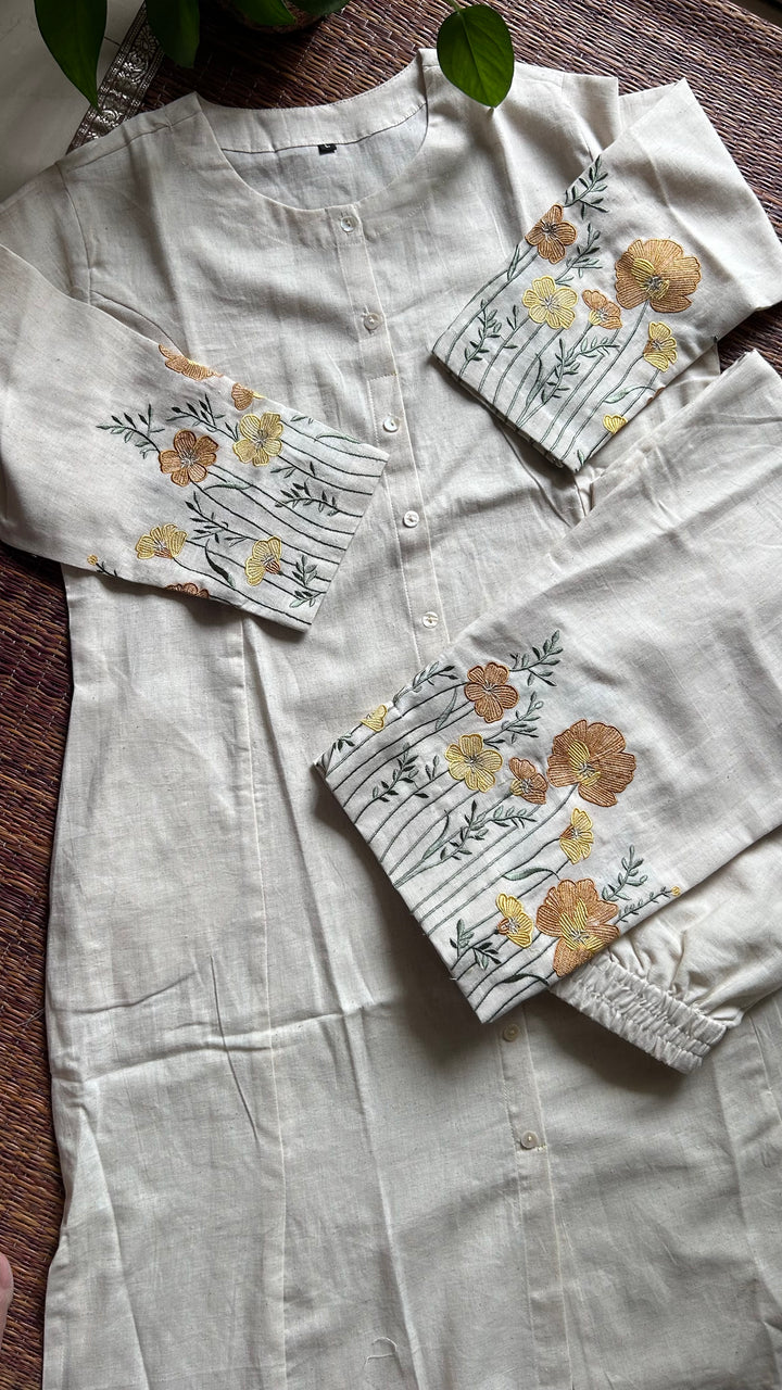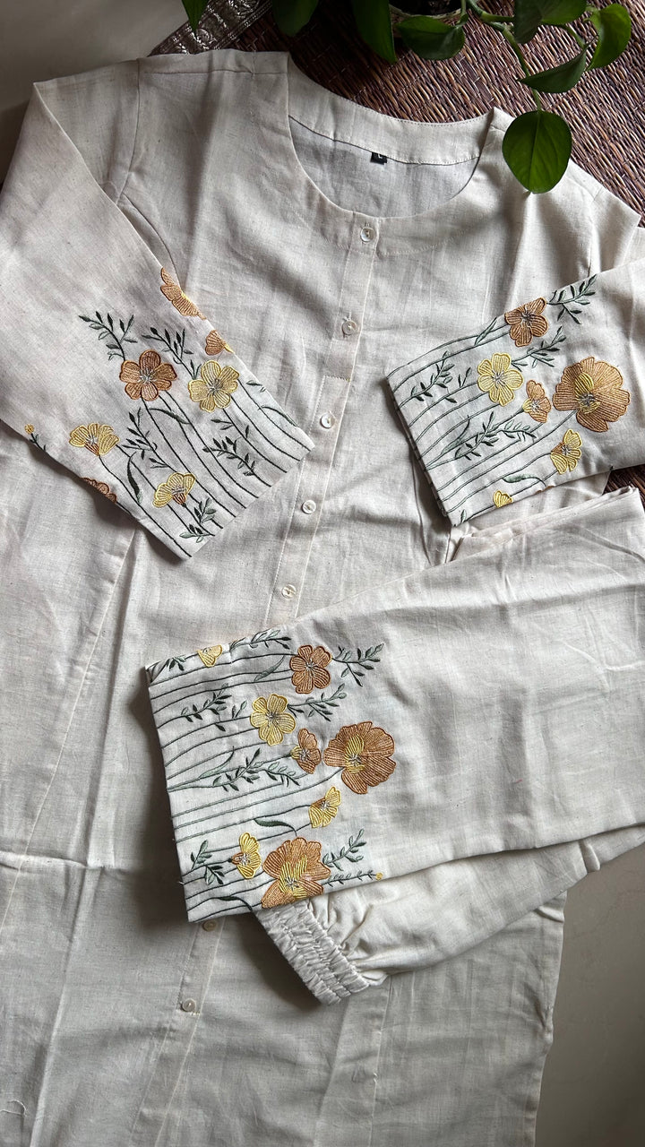 - Front Button 3/4 sleeves cotton kurti with embroidery work paired with embroidery ankle palazzo