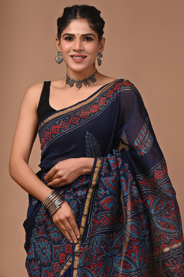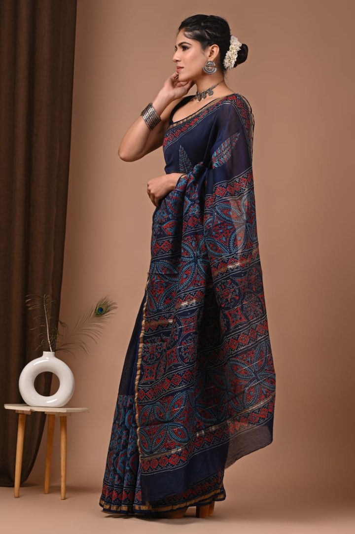 Chanderi Saree In Hand Block Print. This handwoven chanderi saree is crafted in chanderi and features Hand Block Printed motifs all over and a slender look. the blue Chanderi Saree is adorned with delicate borders and embellishments that enhance its visual appeal. Team this saree with heels and fine jewellery to create a trendy look.