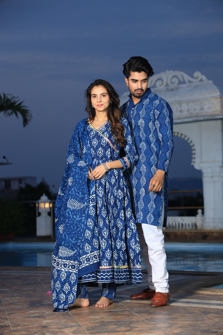 Blue Bagru Block Printed Pure Cotton Twinning Couple Set