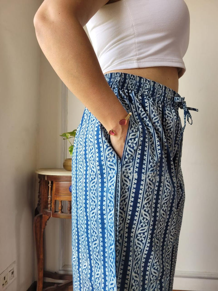 - Blue Cotton bagru hand block print palazzo with pockets.
