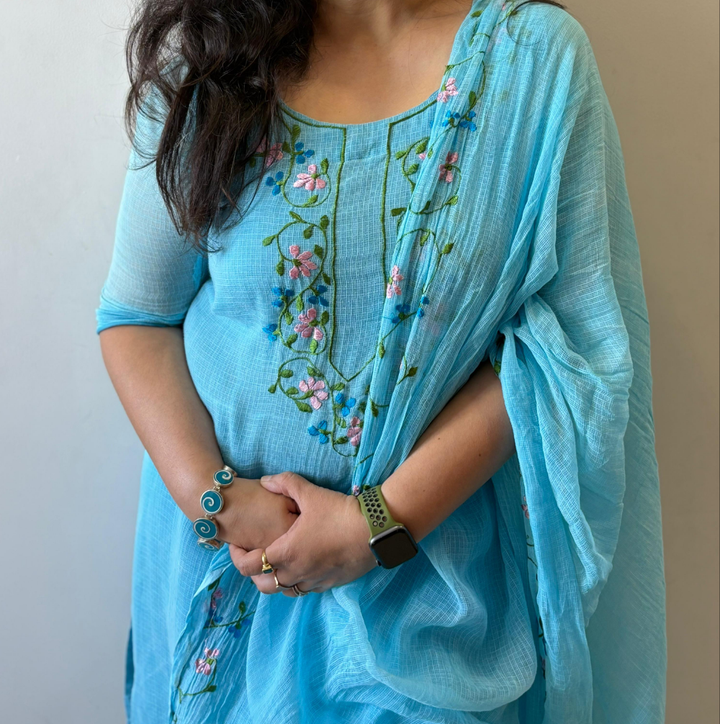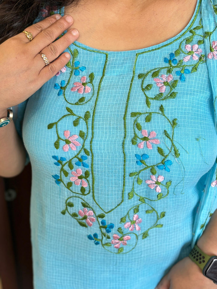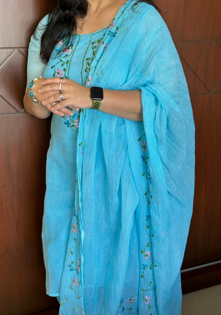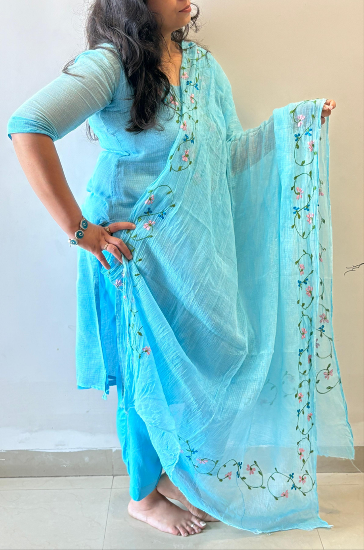 Classic Kota Doriya Embridery Work Suit In blue comes with heavy embroidered Dupatta and Cotton pant.