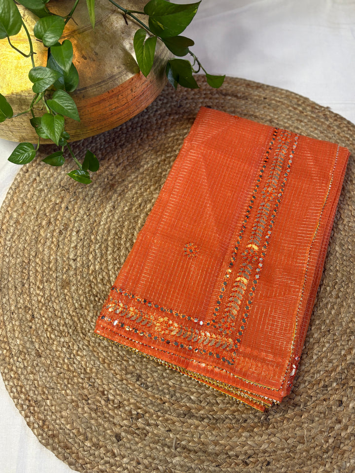 Orange Kota Doria Gota Patti Saree Comes With Blouse. The Saree Comes With Designer Gota Patti Work On Border And Boota. Wear This Kota Doria Saree as Casual Meeting Saree Or Kitty Party Saree. Saree Length - 6.5 Mtr With Blouse.
