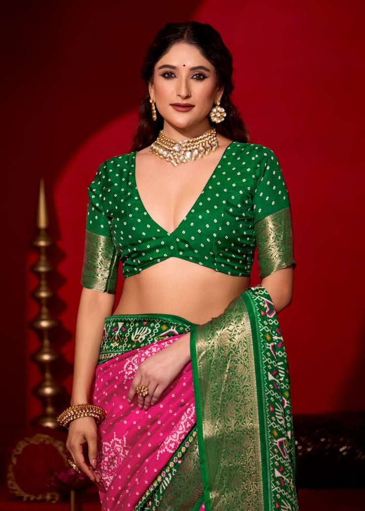 Pashmina Silk Saree In pink and green.This Fancy pashmina Silk Saree Is Full Weaved With Patola Print. This Saree Pattern With Baandhani Boota On Whole Saree As Shown In The Pic. The Saree Comes With Running Silk Blouce Same As Saree Color. Saree Is 6.5 Mtr Long With BlouceLength - Saree Length is standard 6.5 mtr with blouse.