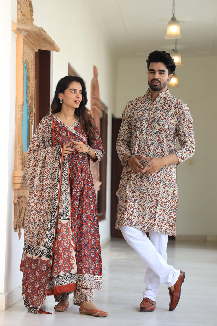 Red Bagru Block Printed Pure Cotton Twinning Couple Set