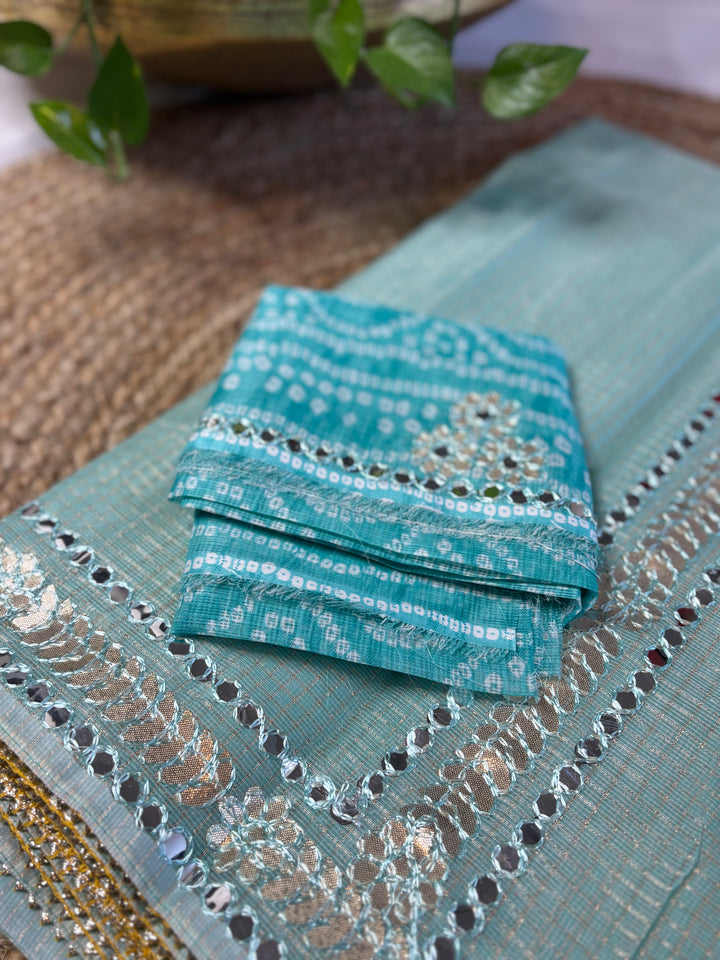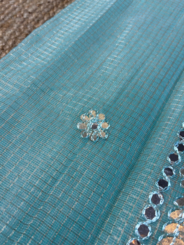 Blue Kota Doria Gota Patti Saree Comes With Blouse. The Saree Comes With Designer Gota Patti Work On Border And Boota. Wear This Kota Doria Saree as Casual Meeting Saree Or Kitty Party Saree. Saree Length - 6.5 Mtr With Blouse.