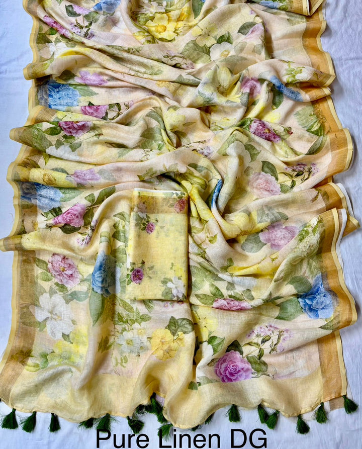 Ready To Drape This Beauty? We Present To Our Classic And Most Love yellow Pure Linen Saree. A Must Have In Your Ethnic Wardrobe As It is An All Season And Occasion Wear Saree. This Saree Features Beautiful Prints All Over And Pallu It Is An Ultra-Lightweight, Skin-Friendly, And Comfortable Saree. It Comes With A Attached Blouse, Allowing You To Customize It In Your Own Style.