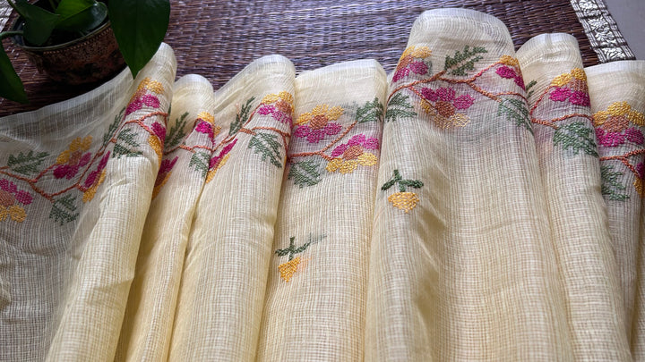 The delicate Cross Stitch embroidery work adds a touch of elegance to this traditional saree, while the kota doria fabric offers a lightweight drape.