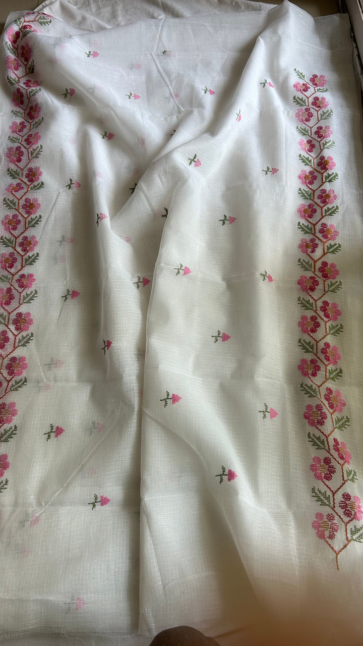 Morni- White Kota Doria Cross Stitch Embroidery Work Saree, This Kota Doria Saree In Cotton Comes With Blouse.