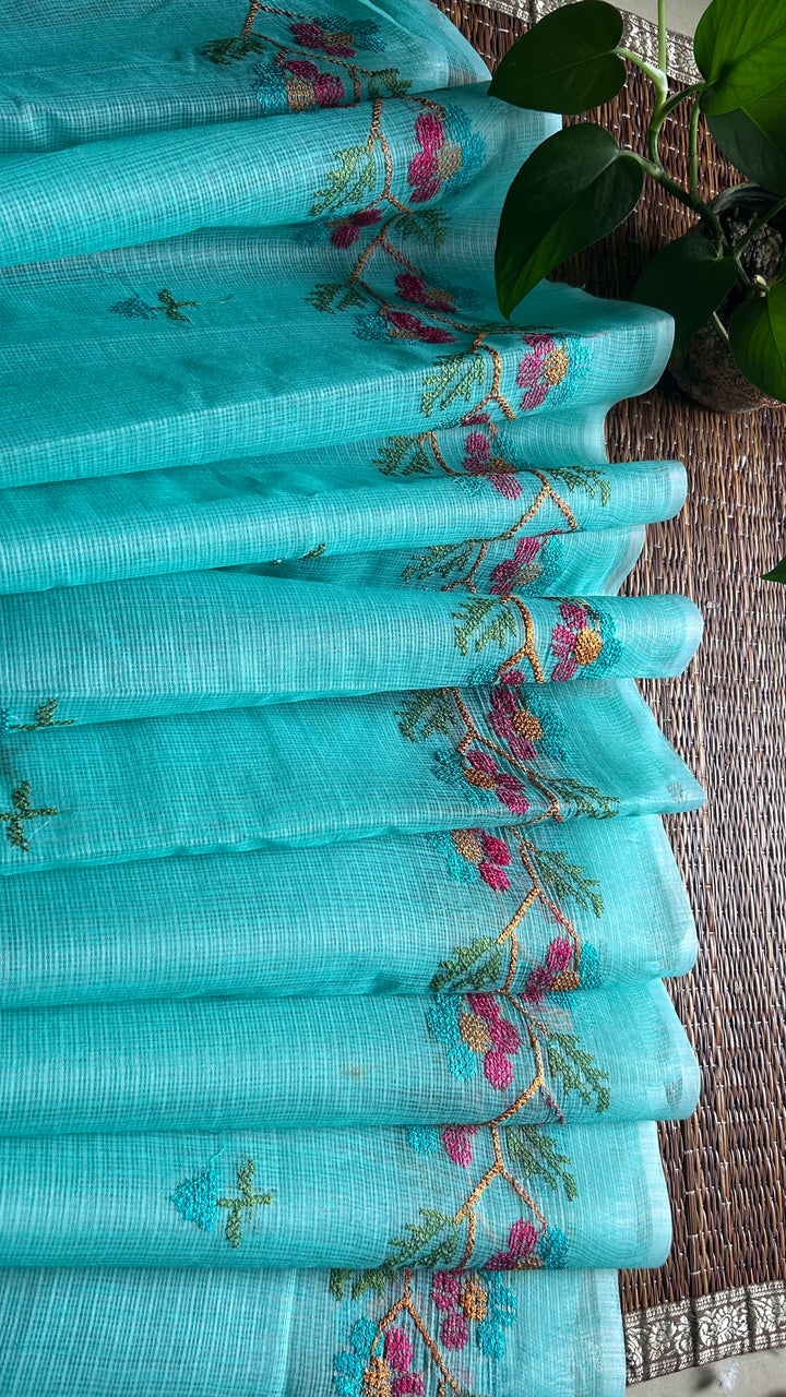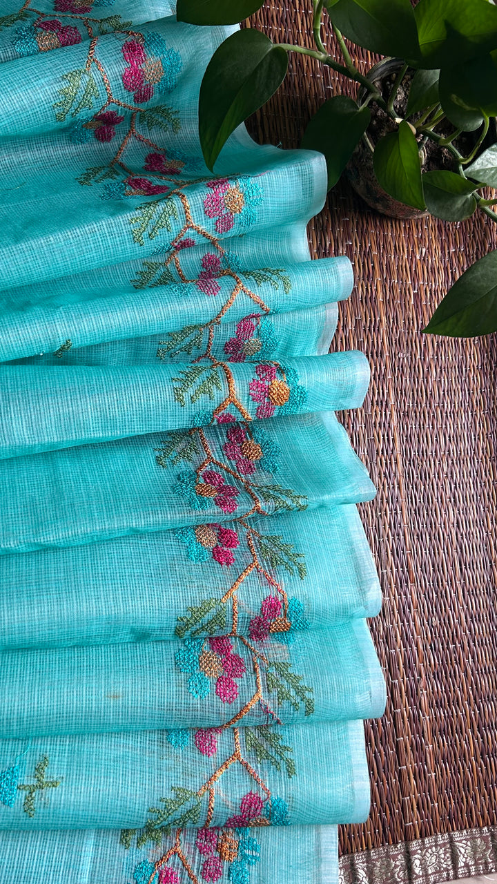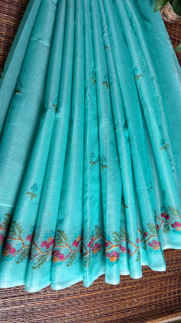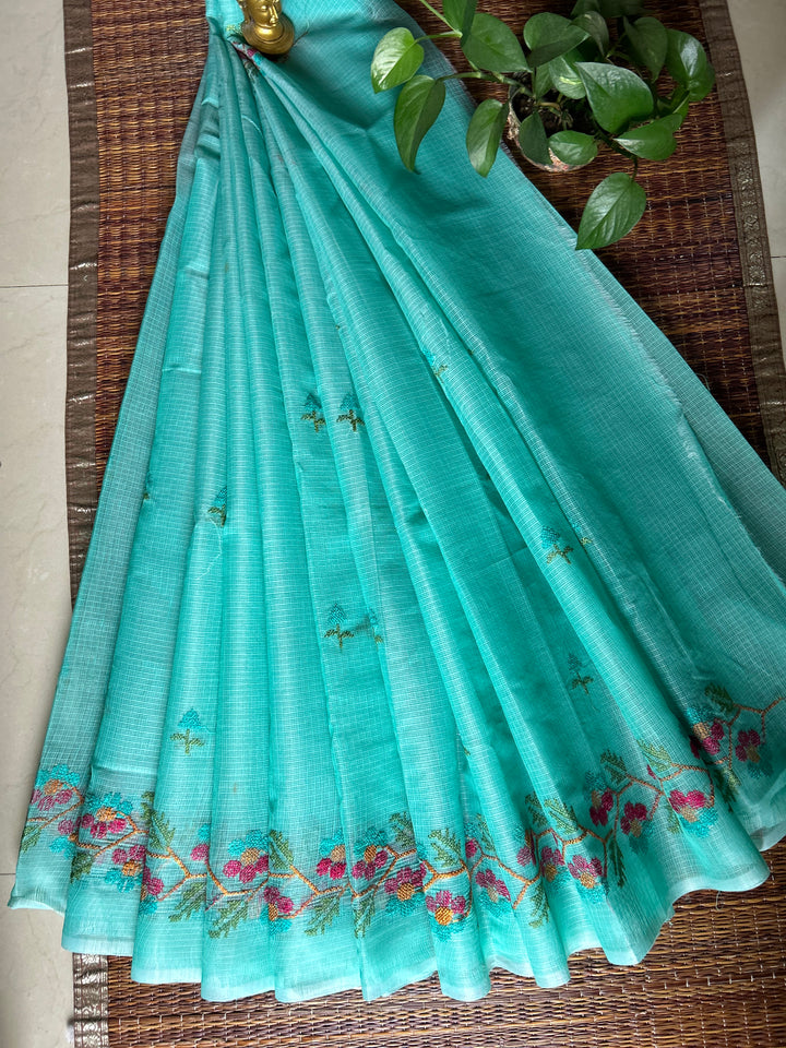 Harkha- Cross Stitch Kota Doria Embroidery Work Saree In Sea Green