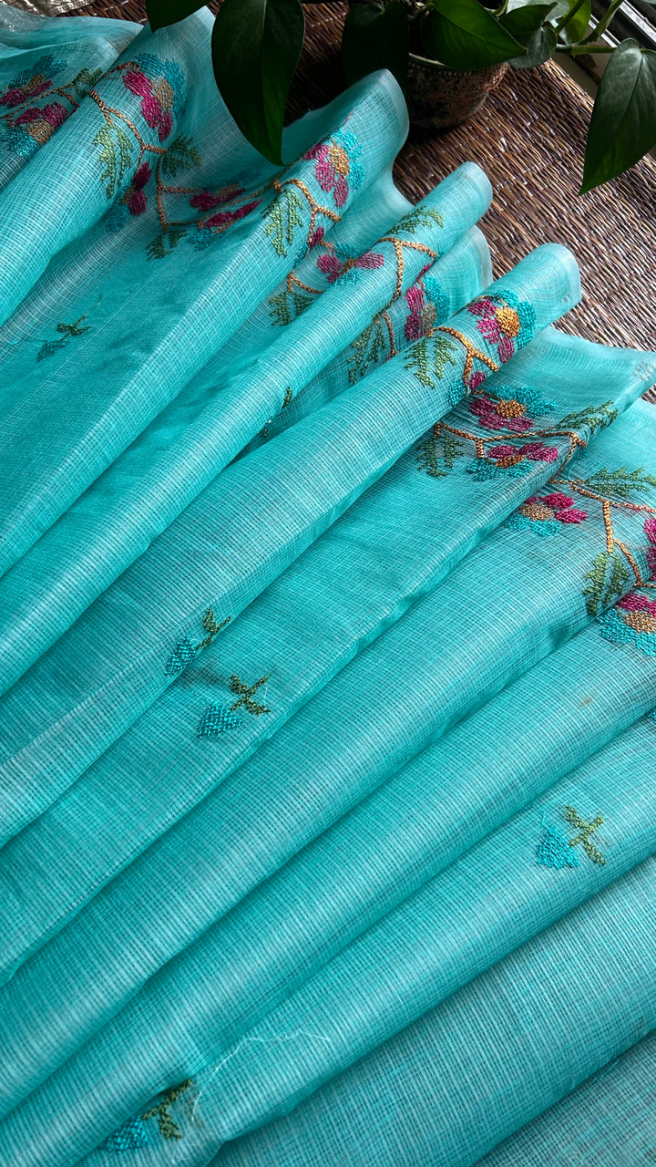 Harkha- Sea Green Kota Doria Cross Stitch Embroidery Work Saree, This Kota Doria Saree In Cotton Comes With Blouse.