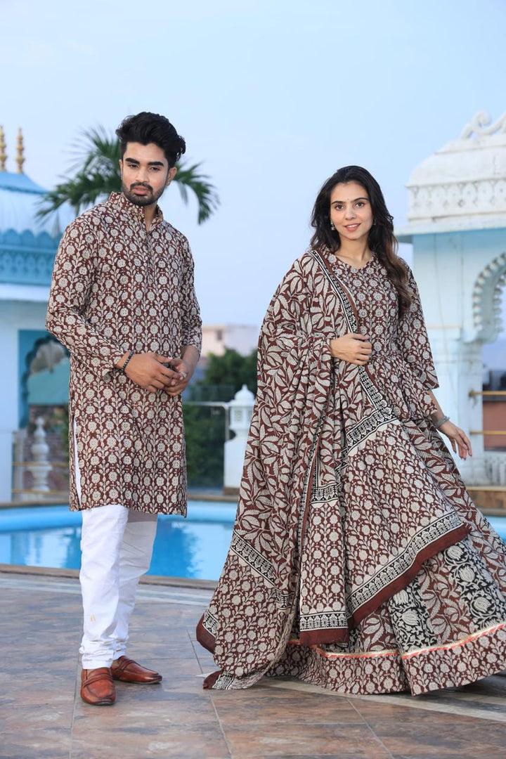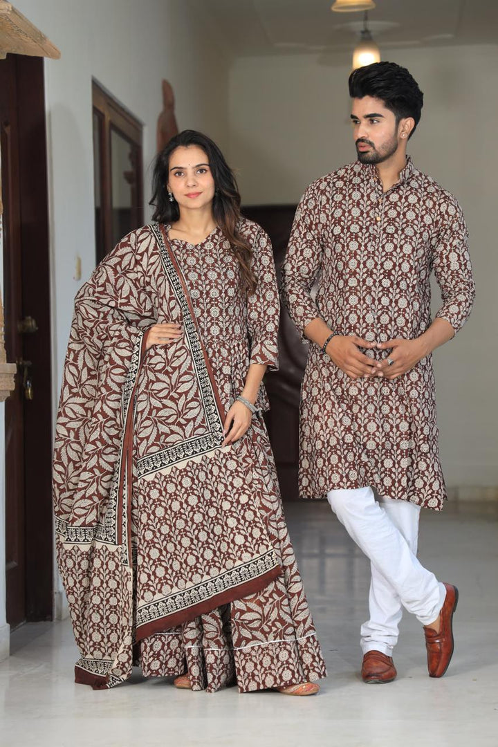 Brown colour Pure Cotton Twinning Couple Set In Block Print