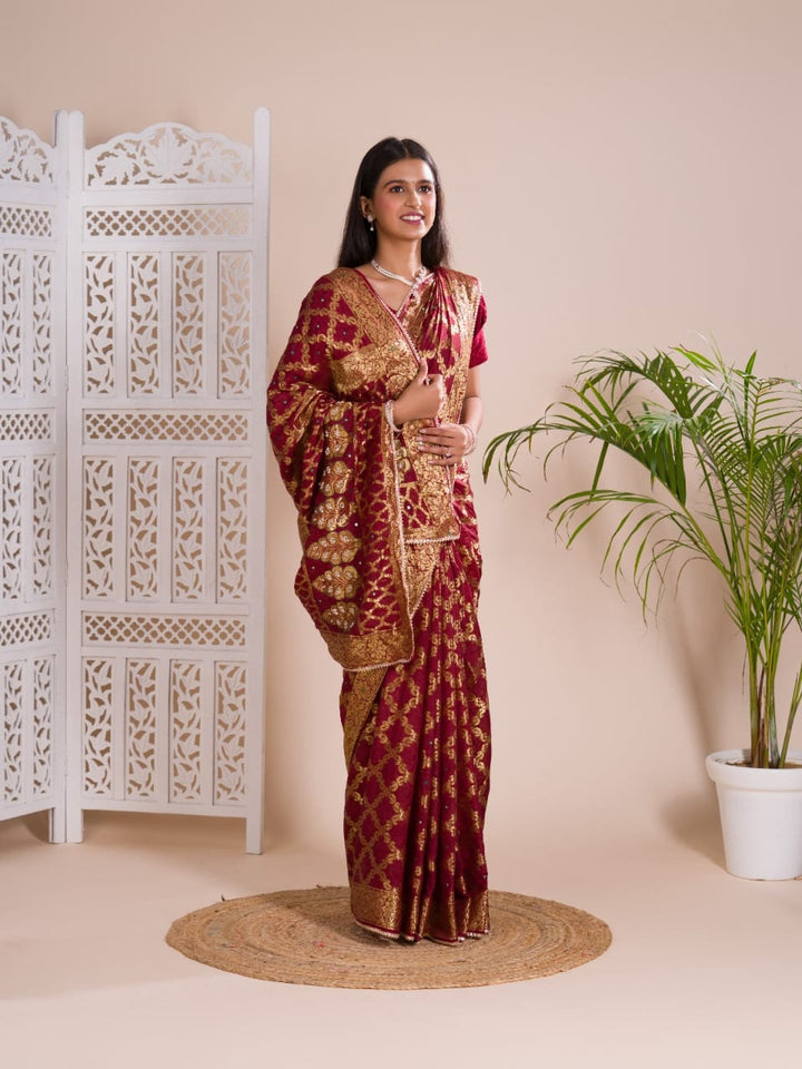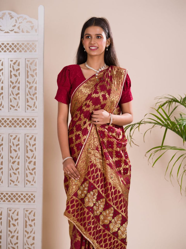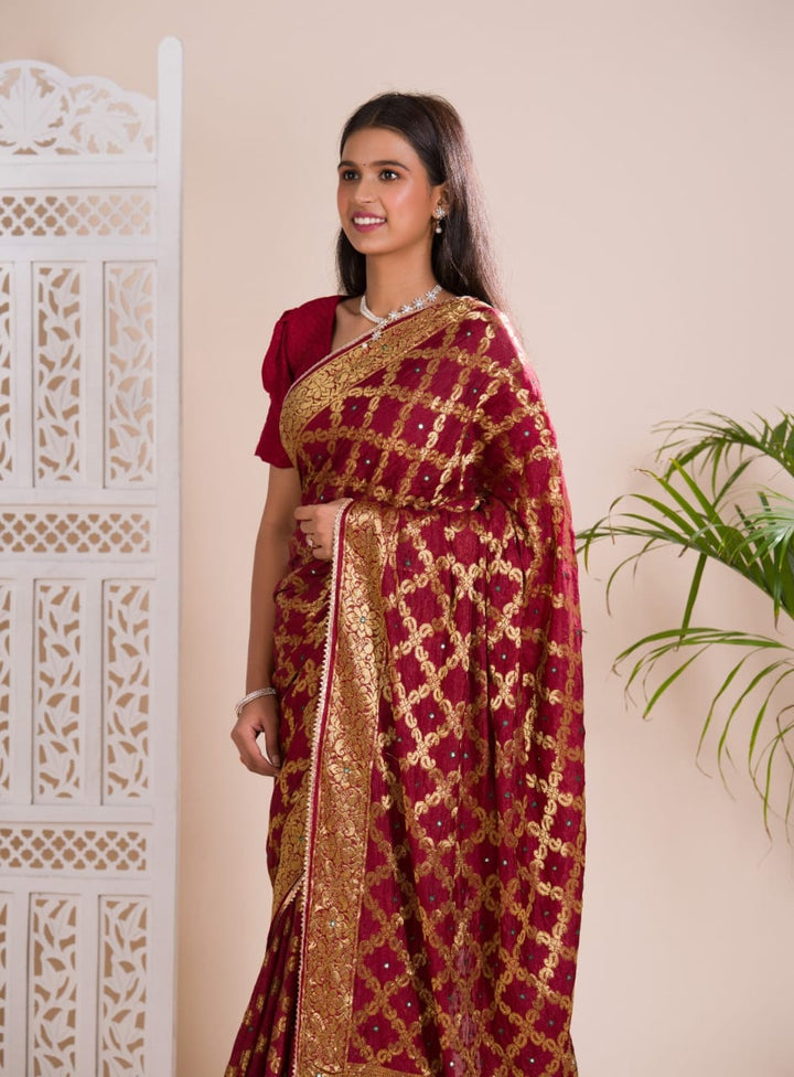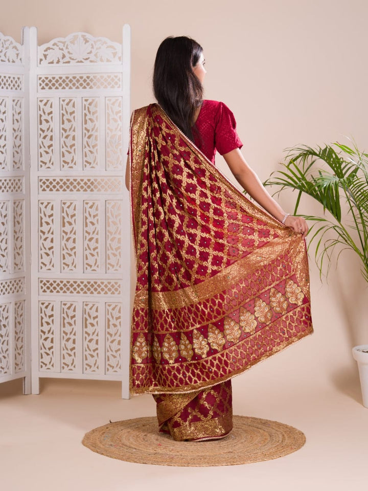 Maroon Ghatchola Banarasee Silk Hand Mirror Work Saree