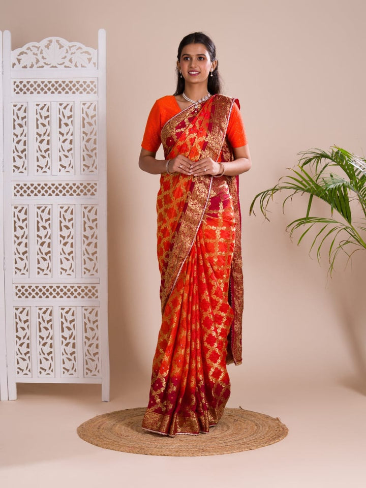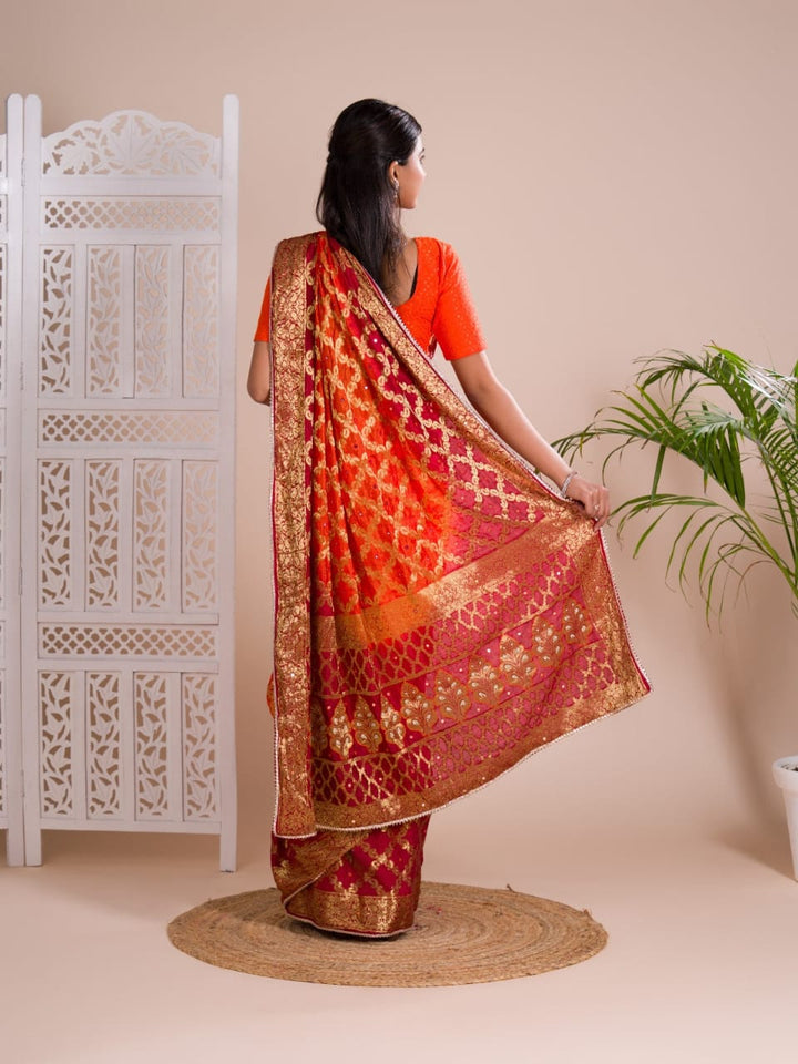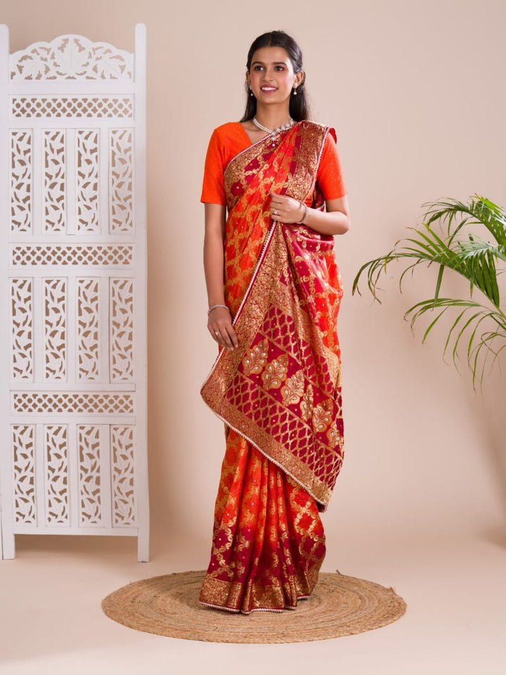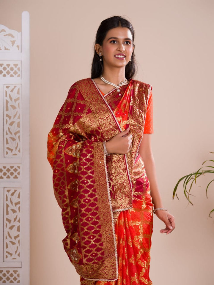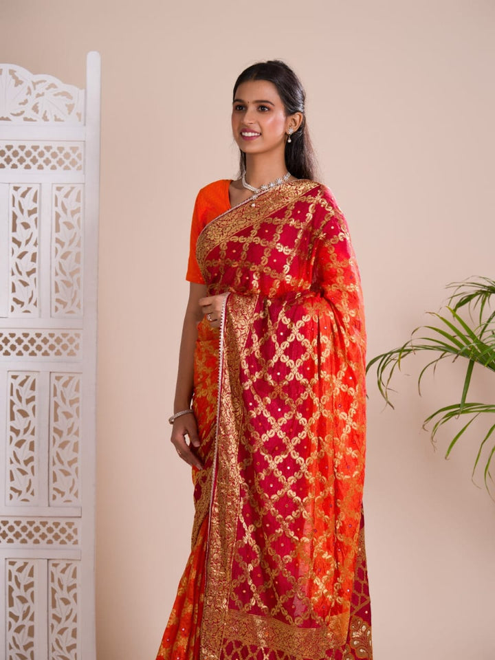 Orange & Red Ghatchola Banarasee Silk Hand Mirror Work Saree