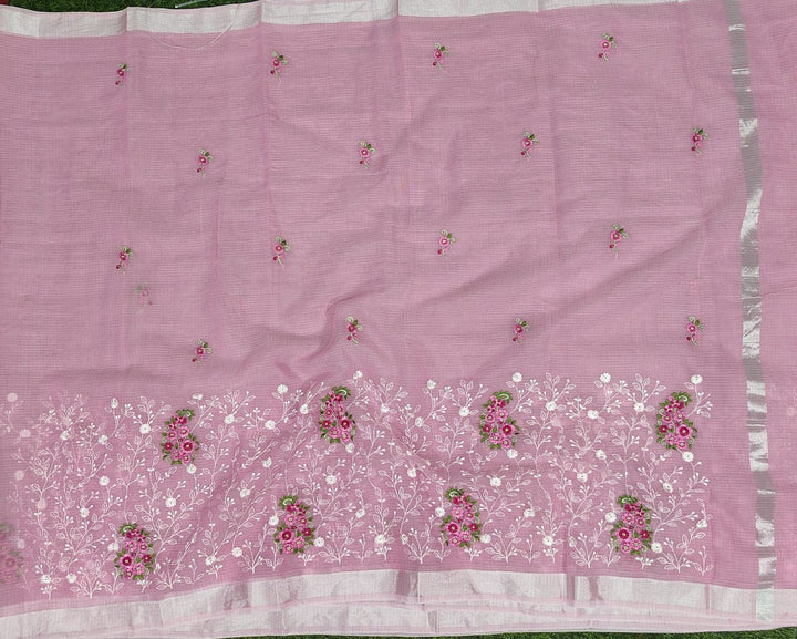 Pink Kota Doria Embroidery Work Sari