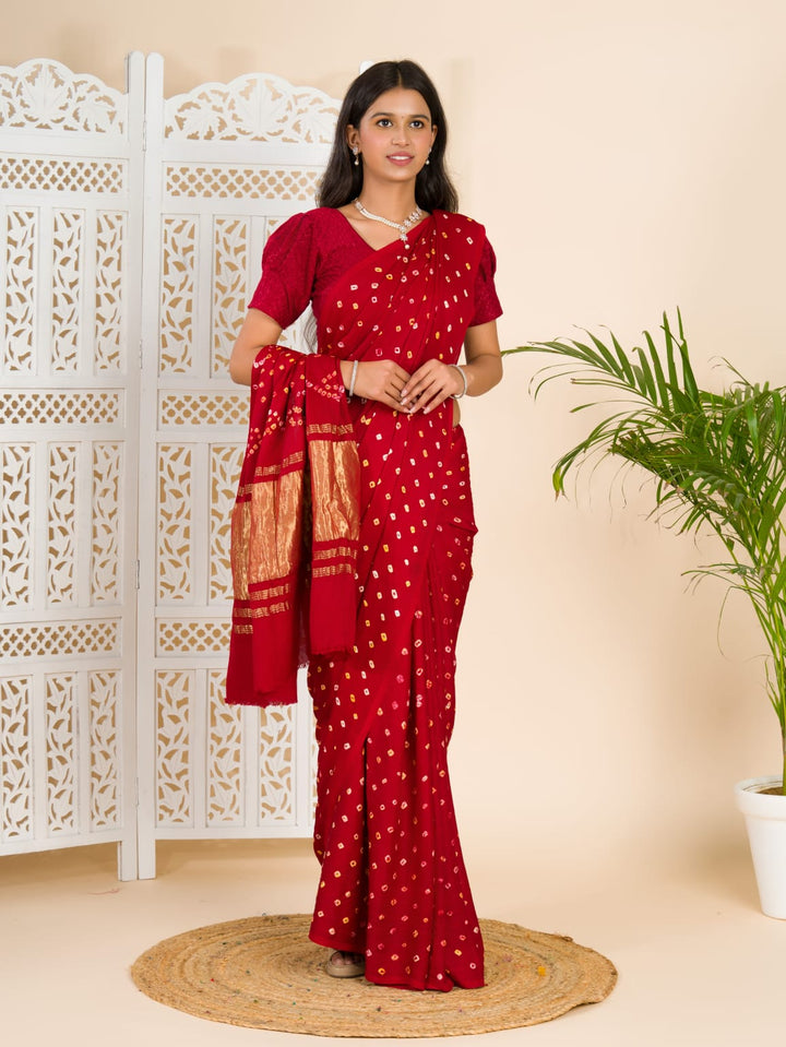 Maroon Model Gaji Silk Saree in dot work style Are Always In Fashion With Their Royal Look, This Silk Saree Will Make Your Look Flawless On Any Of Your Special Occasion. The Soft fabric Add A Touch Of Elegance. This Bandhani Silk Saree Features Beautiful Single Dot Work All Over.