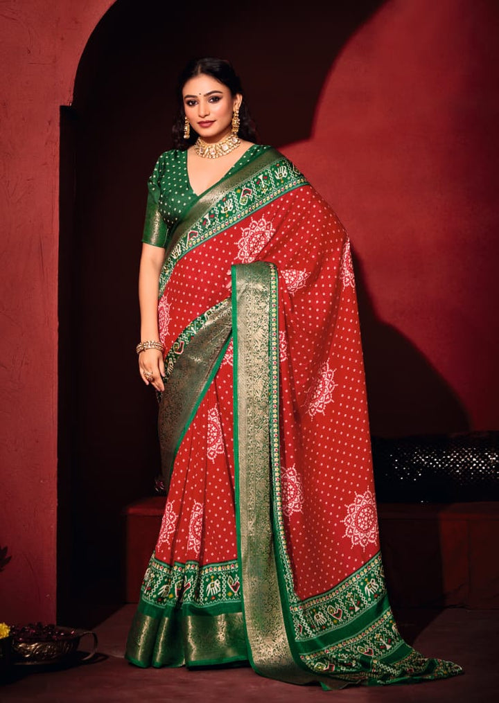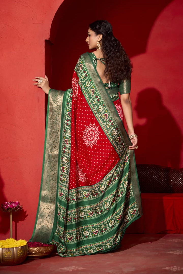 Red & Green Pashmina Silk Patola Print Saree