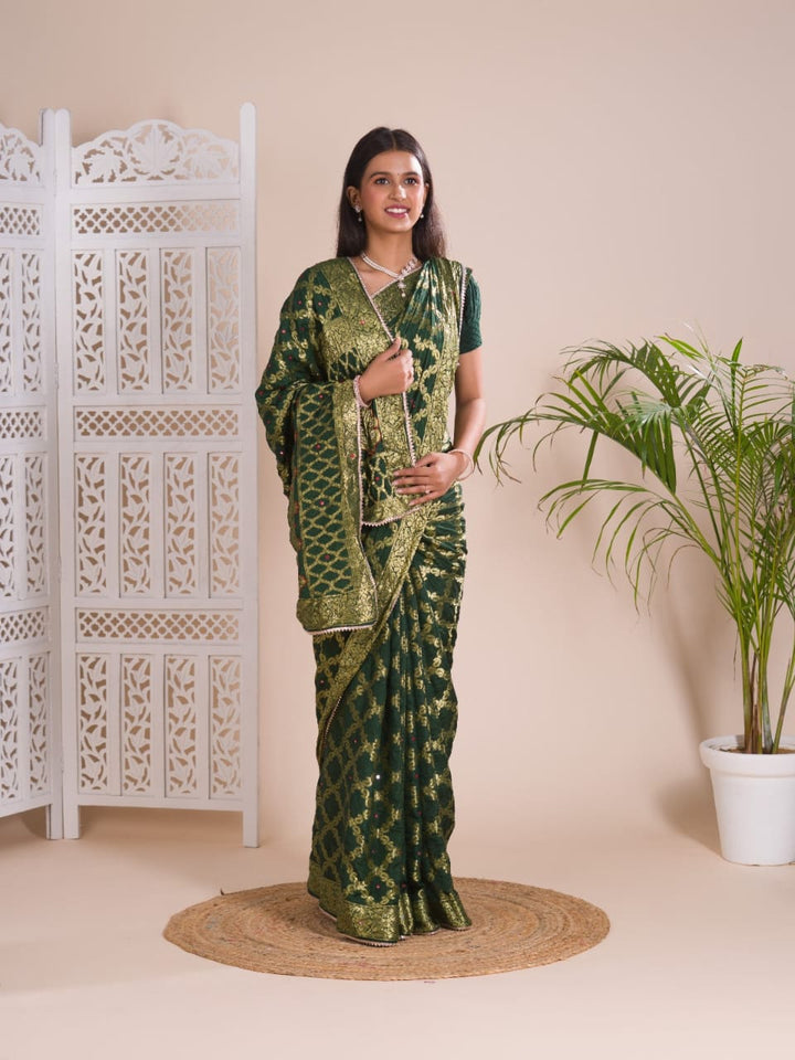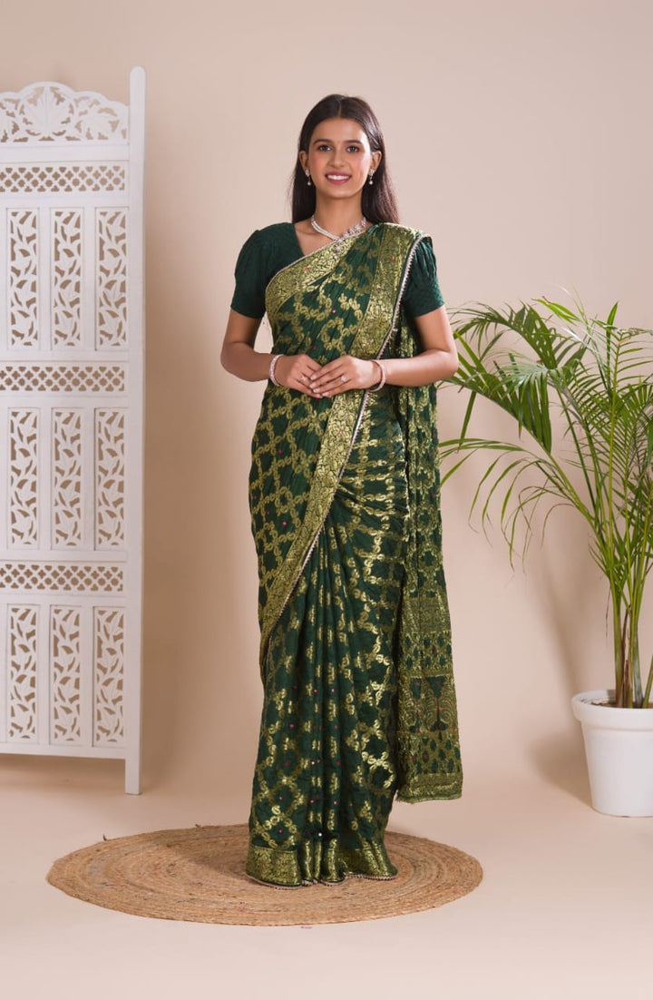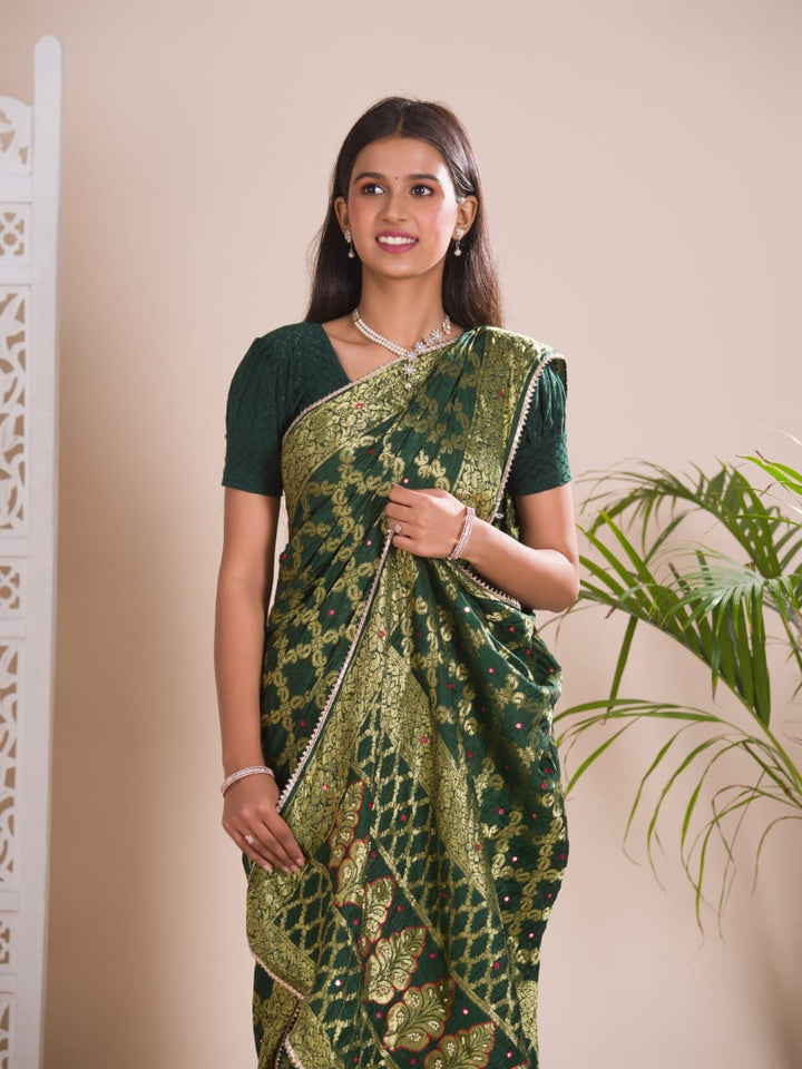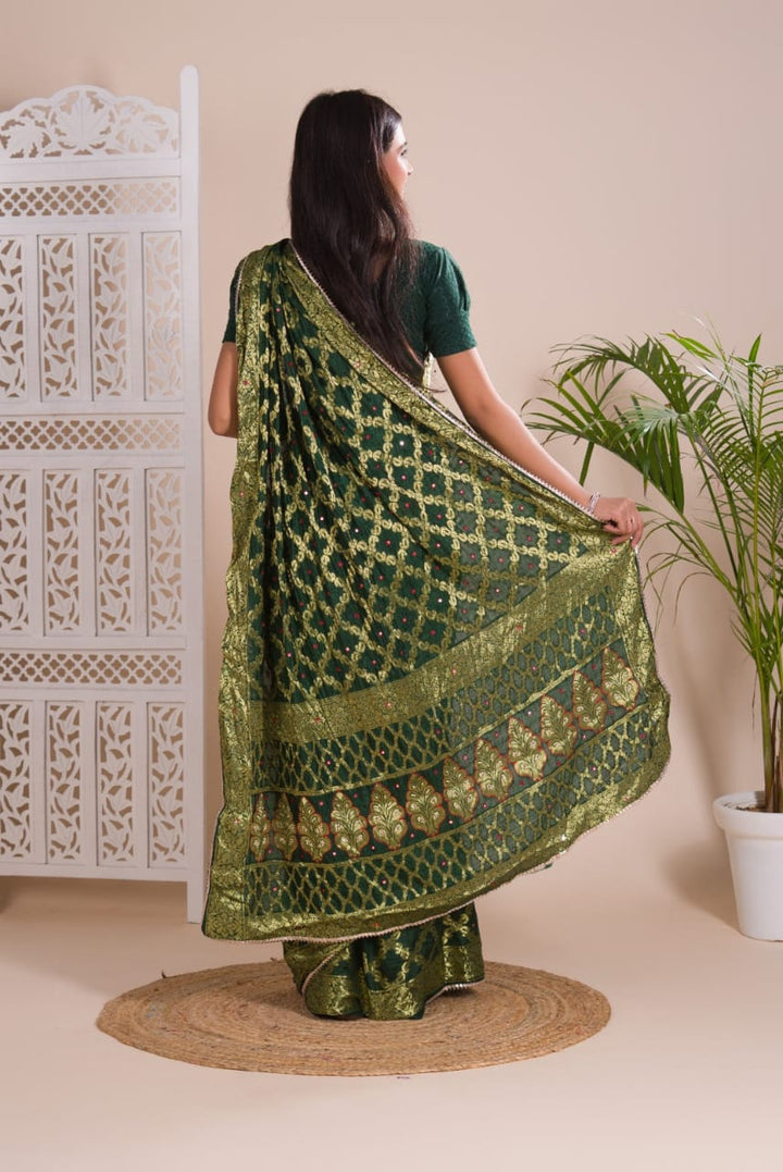 Green Ghatchola Banarasee Silk Hand Mirror Work Saree