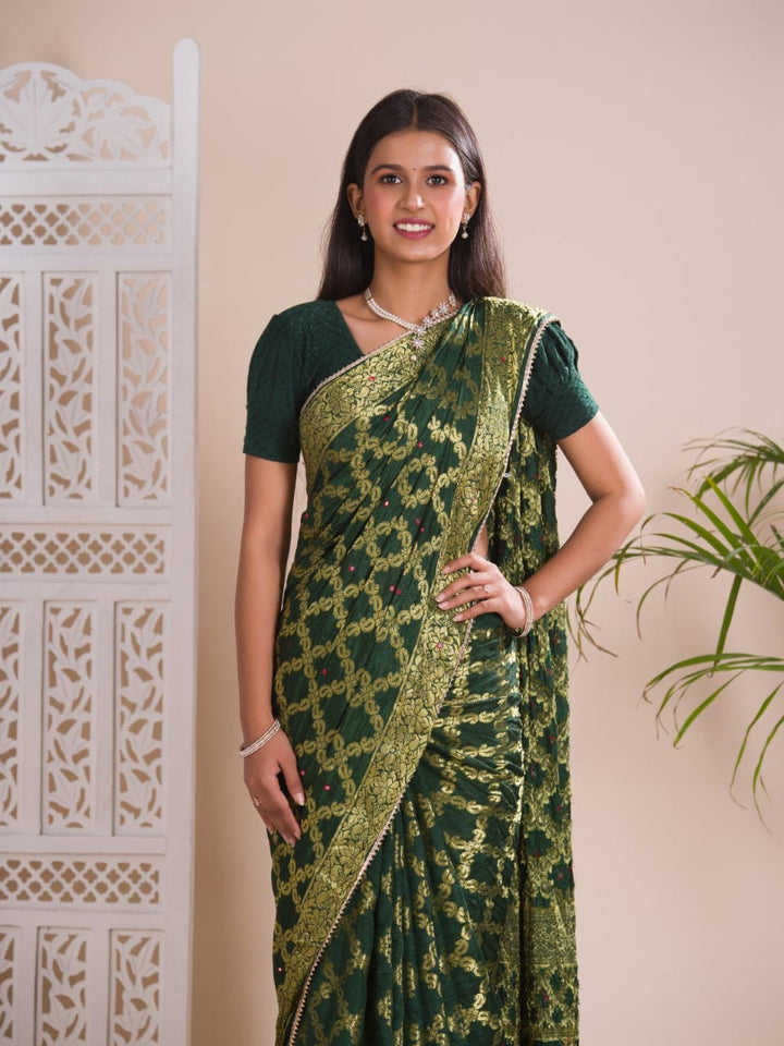 Ghatchola Banarasi Silk Saree In green.This Fancy Ghatchola Silk Saree Is Full Weaved With Zari Check With Hand Mirror Work. This Saree Pattern With Baandhani Boota On Whole Saree As Shown In The Pic. The Saree Comes With Running Silk Blouce Same As Saree Color. Saree Is 6.5 Mtr Long With BlouceLength - Saree Length is standard 6.5 mtr with blouse.