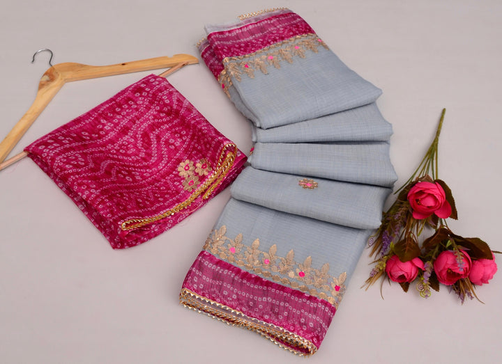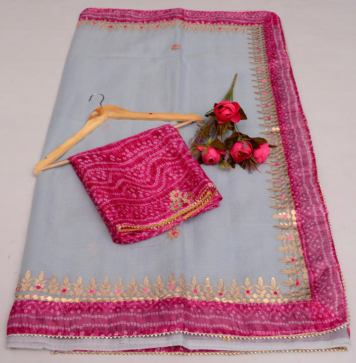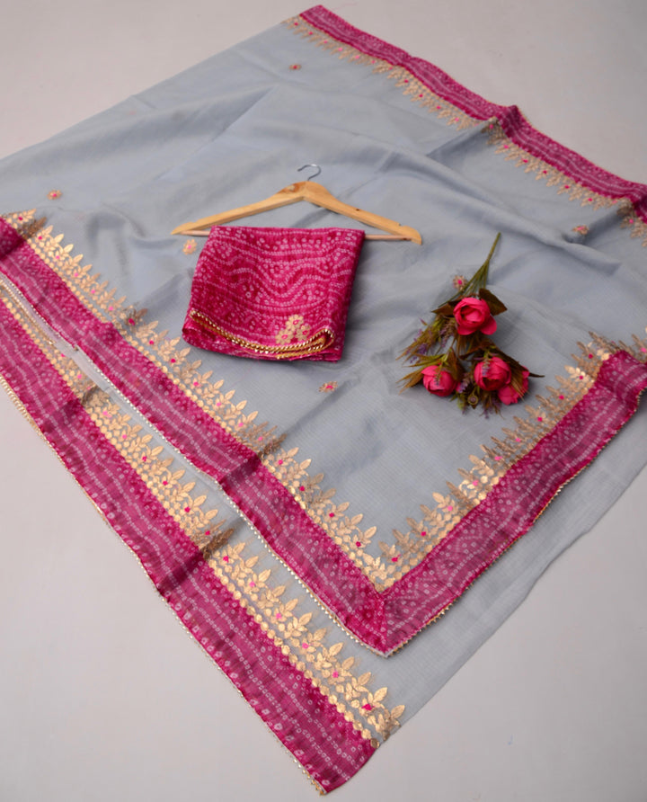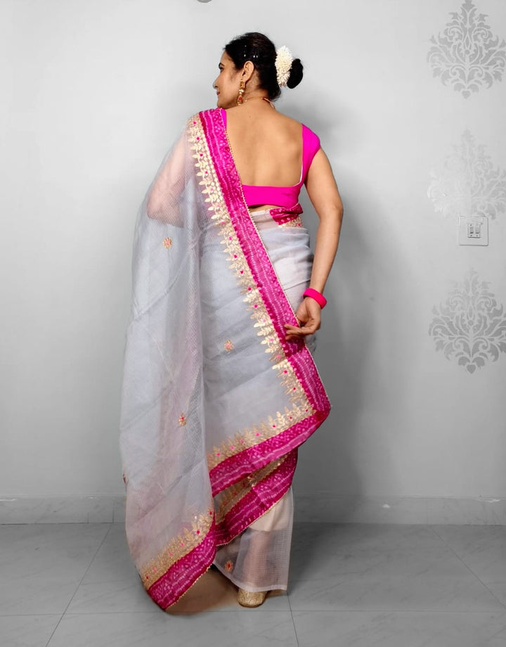 Taruni- Grey Kota Doria Gota Patti Saree Comes With Blouse. The Saree Comes With Designer Gota Patti Work On Border And Boota. Wear This Kota Doria Saree as Casual Meeting Saree Or Kitty Party Saree. Saree Length - 6.5 Mtr With Blouse.