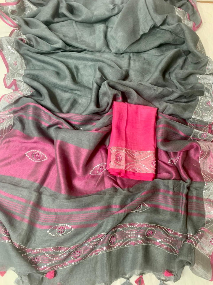 Grey Pure Linen Embroidery Saree