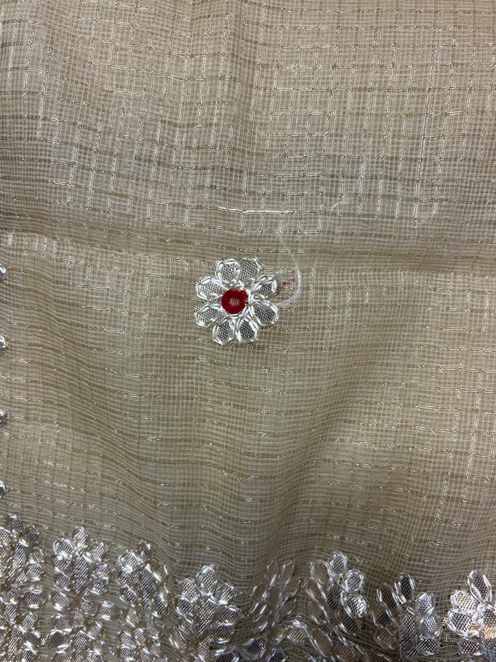 Brown Kota Doria Gota Patti Saree Comes With Blouse. The Saree Comes With Designer Gota Patti Work On Border And Boota. Wear This Kota Doria Saree as Casual Meeting Saree Or Kitty Party Saree. Saree Length - 6.5 Mtr With Blouse.