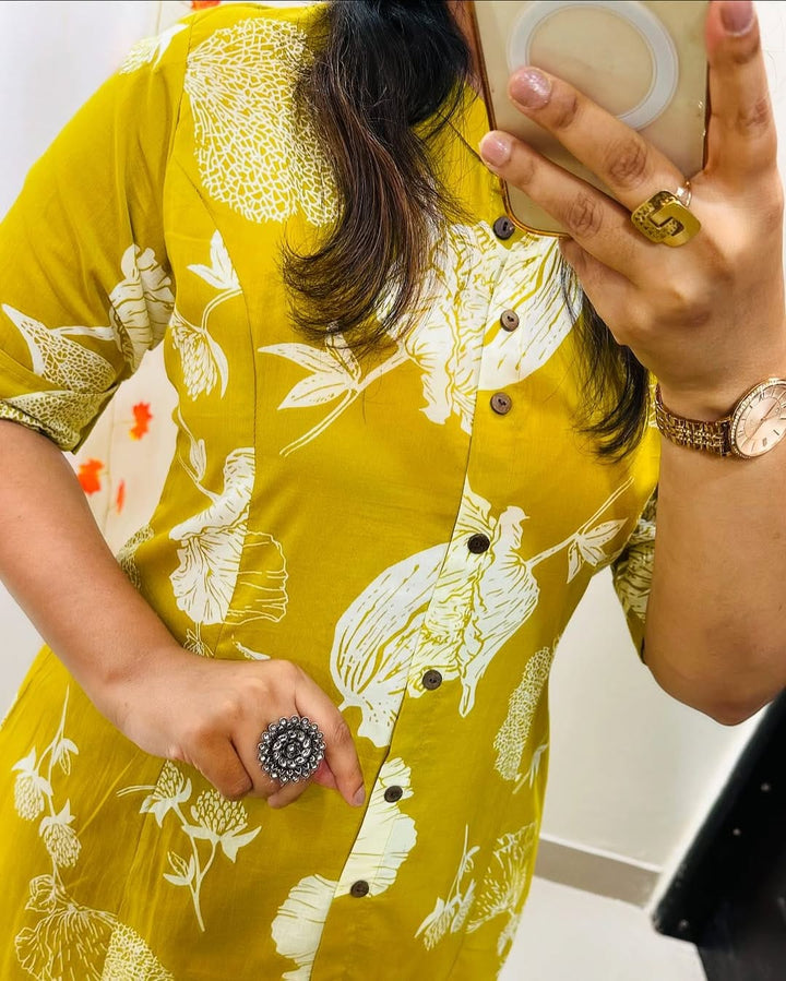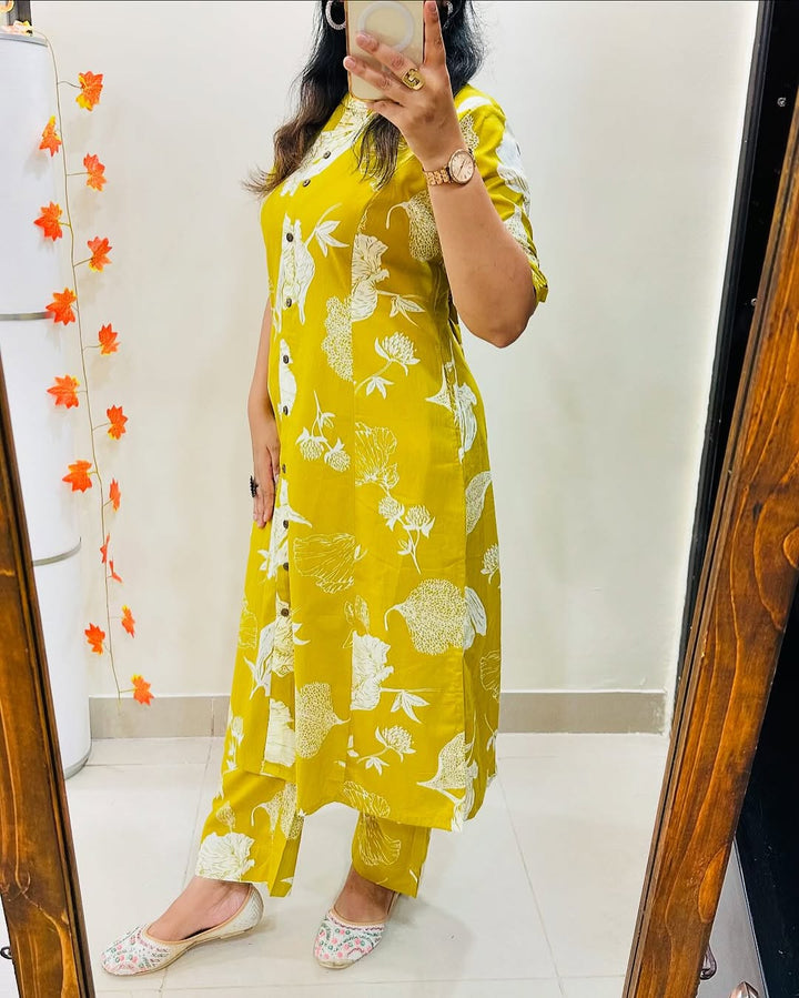 • yellow printed Cotton Designer Kurti Pant Co-ord Set