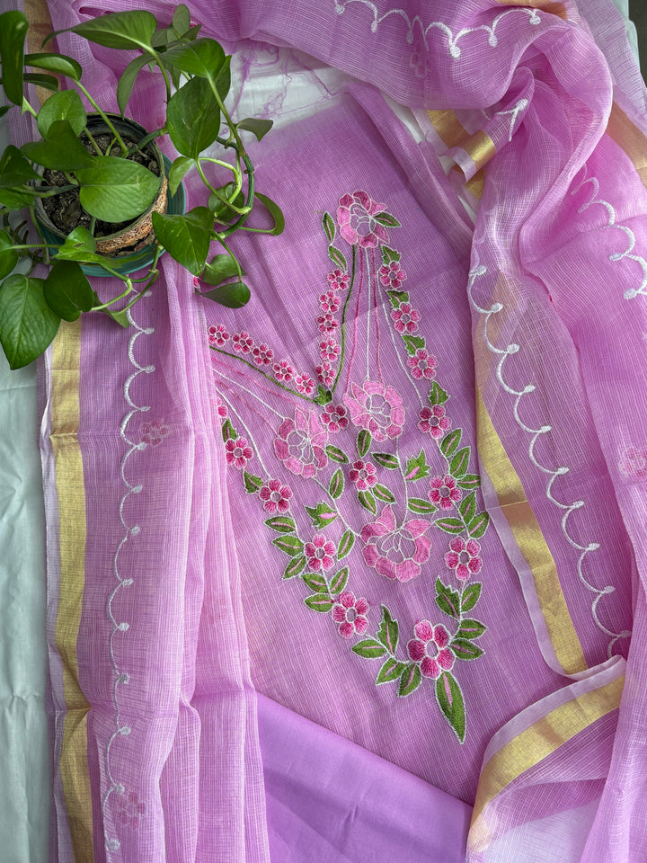 Kamboli Kota Doria Embroidered Suit Set In Pink