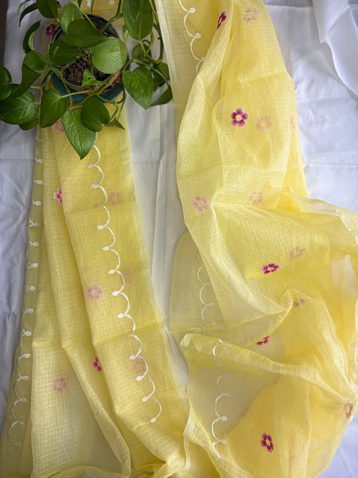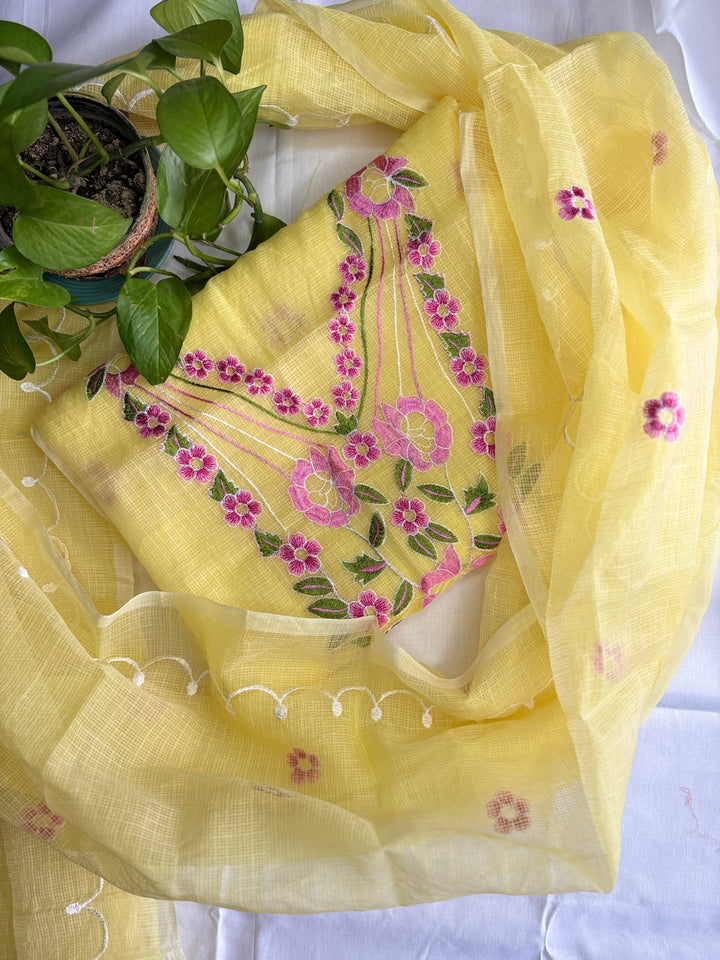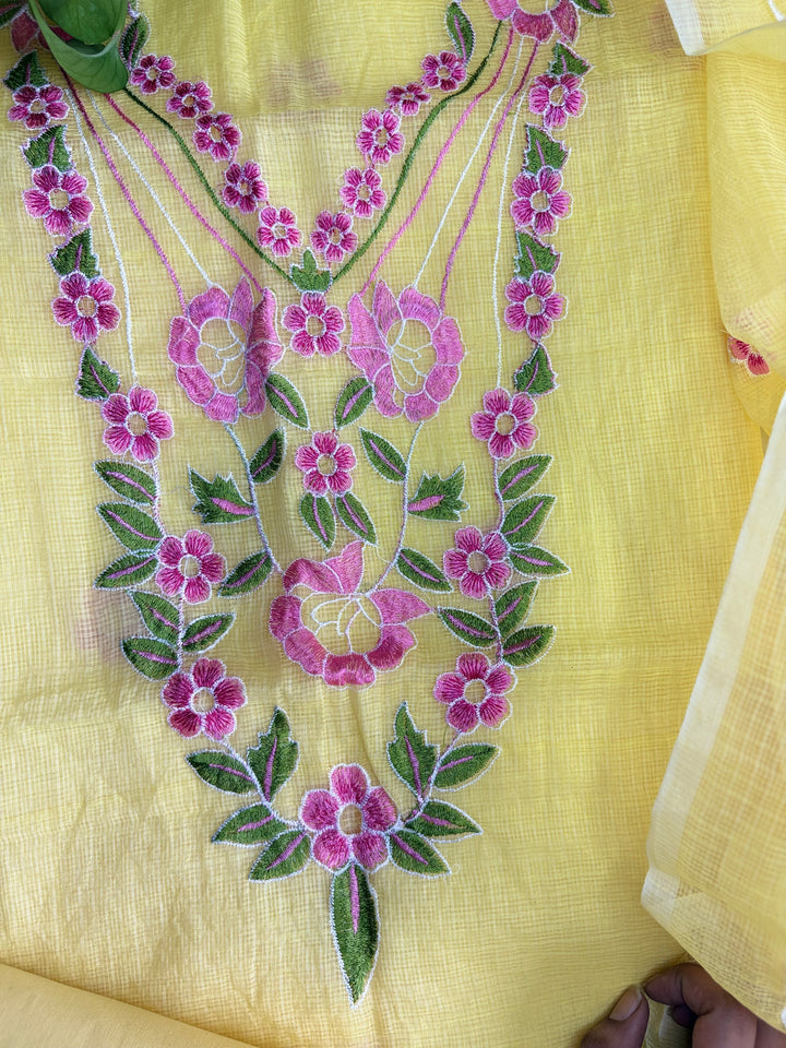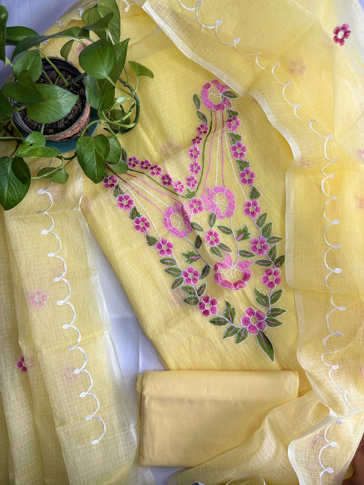 Kota Doria Embroidered Suit Set In yellow Comes With 3 Pieces Suit 2.5 Mtr Top In Kota ,2.5 Mtr Dupatta In Kota,2.5 Mtr Bottom In Cotton. You Can Carry Beautiful Natural Stone Earrings With It. This Kota Doria Suit Has Beautiful Work Done By Our Karigars.,Free Shipping And Cod Available, Shipping Worldwide.