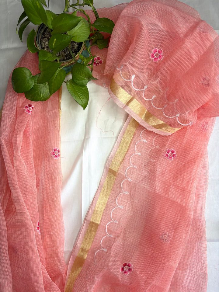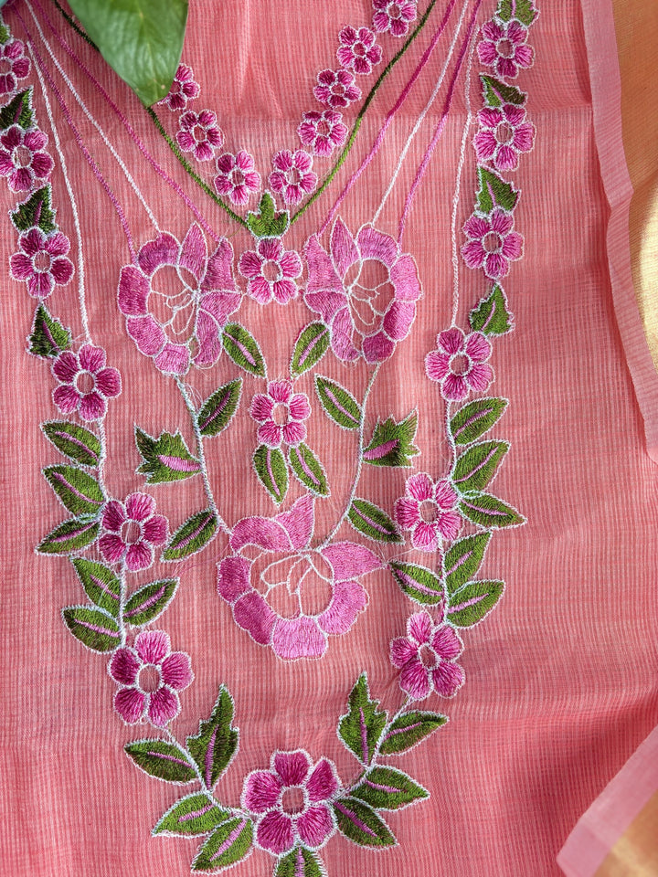 Kota Doria Embroidered Suit Set In Peach Comes With 3 Pieces Suit 2.5 Mtr Top In Kota ,2.5 Mtr Dupatta In Kota,2.5 Mtr Bottom In Cotton. You Can Carry Beautiful Natural Stone Earrings With It. This Kota Doria Suit Has Beautiful Work Done By Our Karigars.,Free Shipping And Cod Available, Shipping Worldwide.