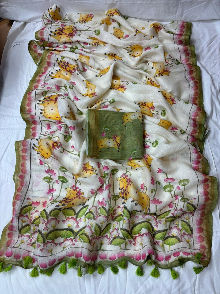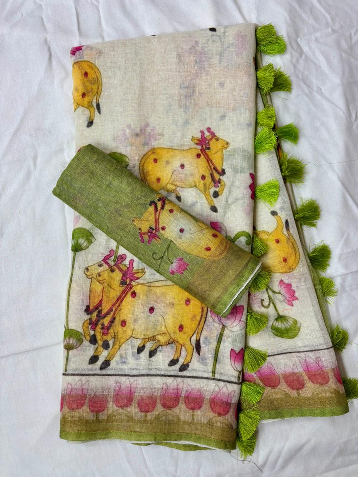 Ditya Pichwai Work Floral Pure Linen Saree