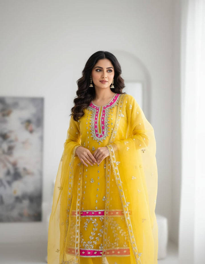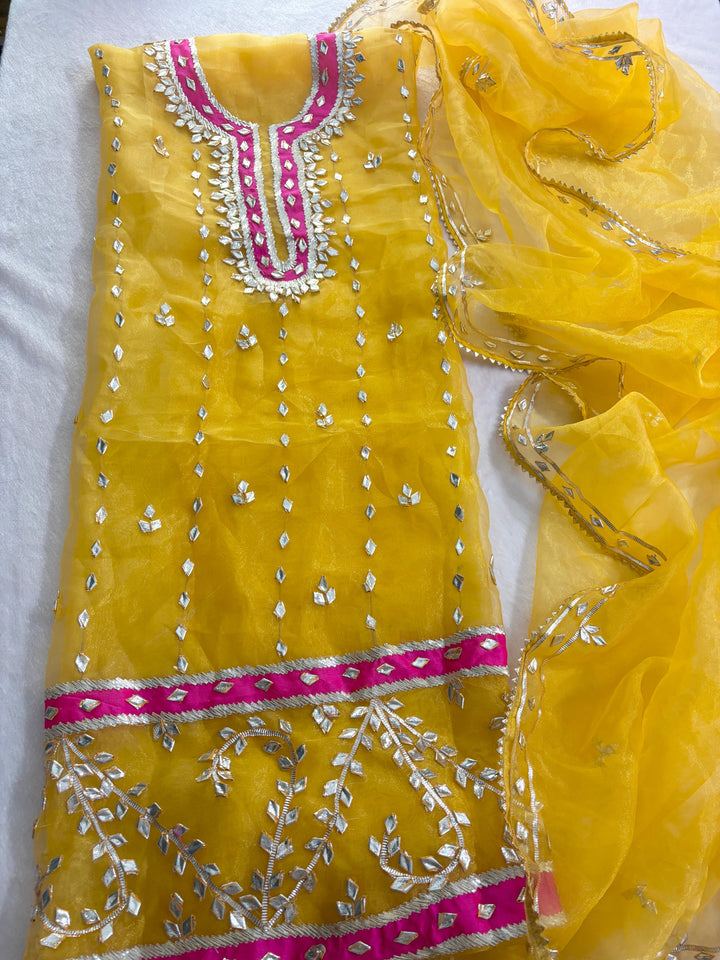 Yellow Color Organza heavy gota patti neck hand Work Suit With Designer Dupatta,This Three Piece Salwar Suit Comes With Matching Bottom Of Dupatta Color, Each Fabric Is 2.5 Mtr Long.