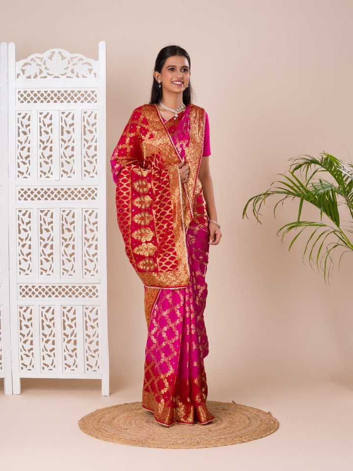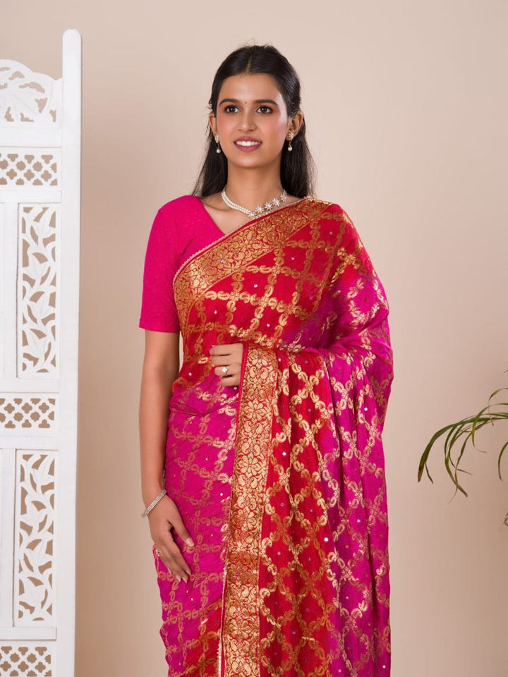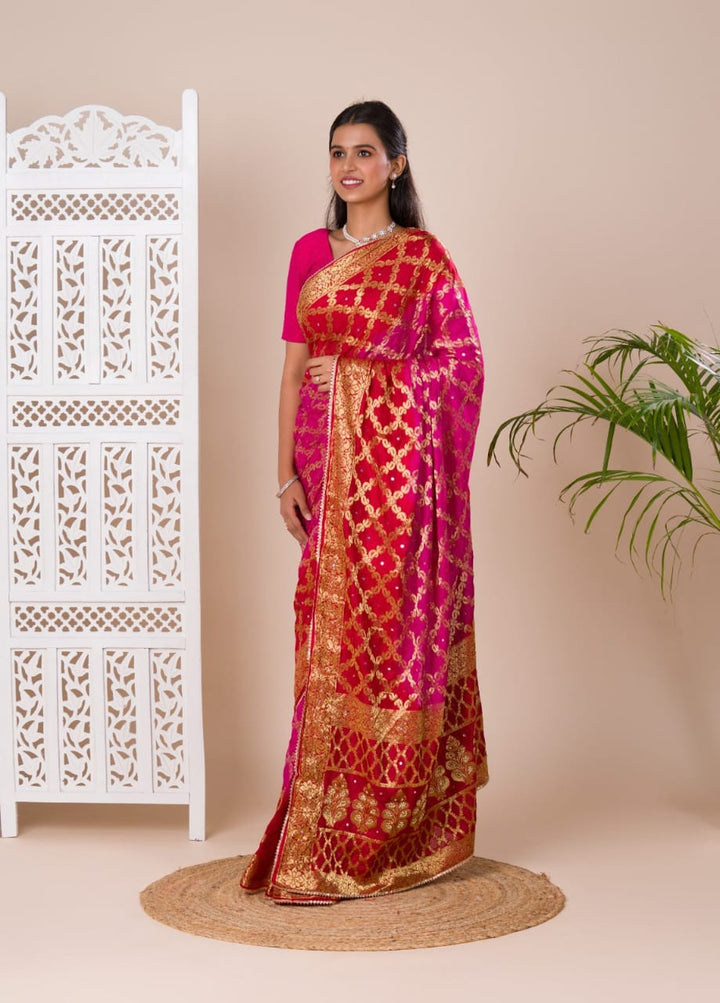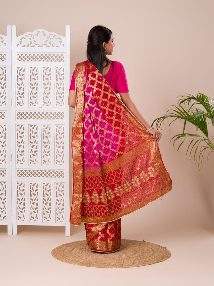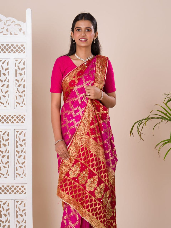 Pink Ghatchola Banarasee Silk Hand Mirror Work Saree