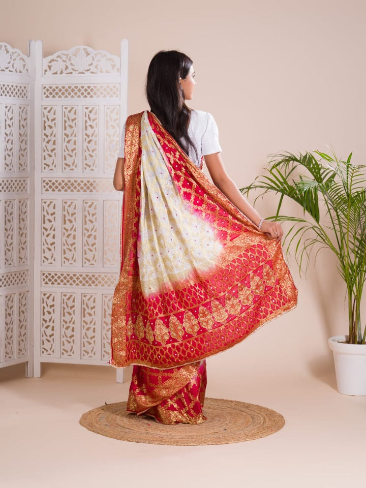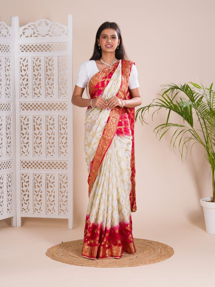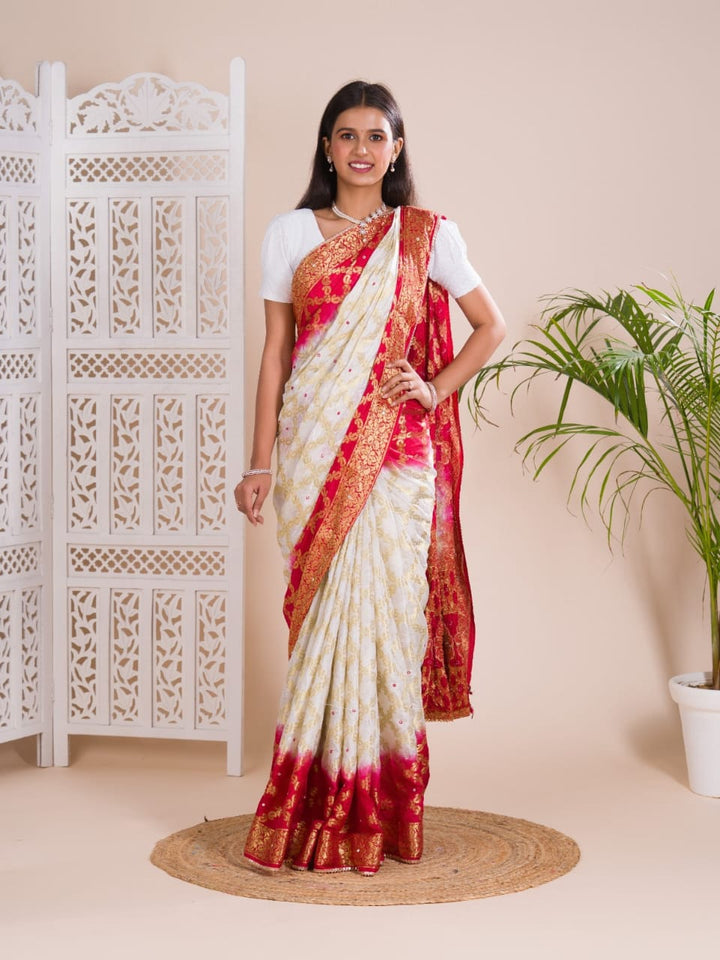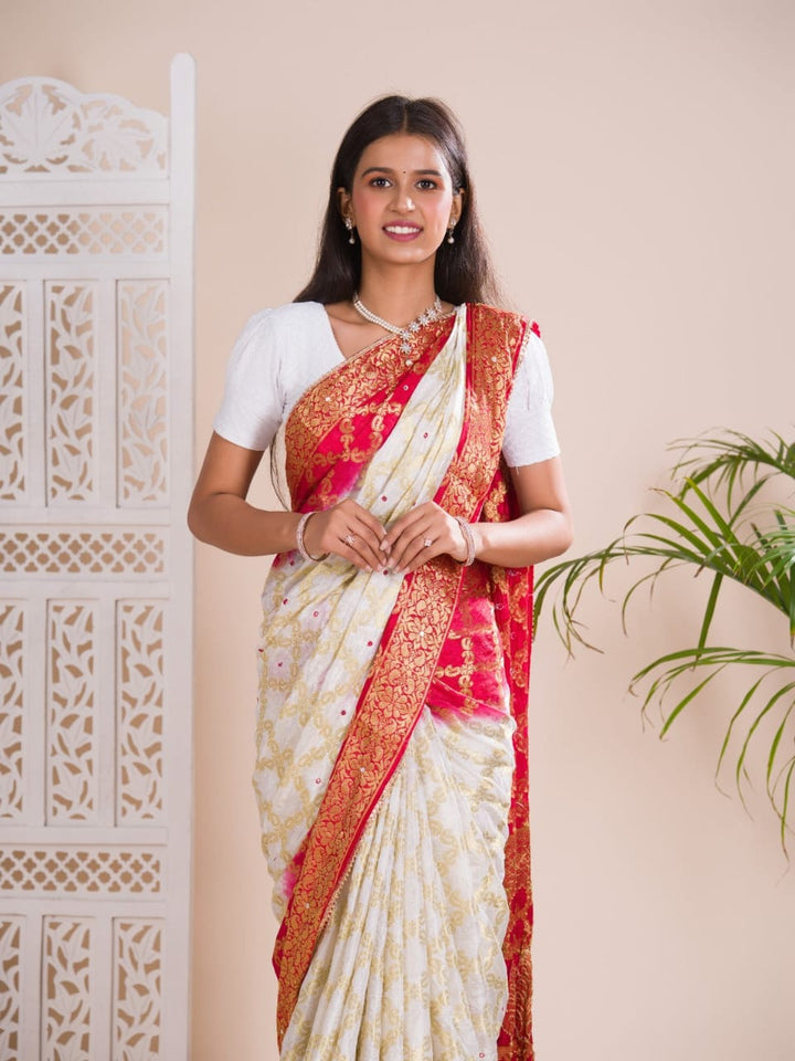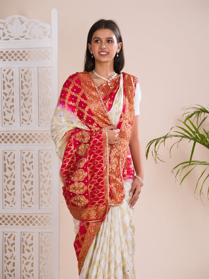 White & Red Ghatchola Banarasee Silk Hand Mirror Work Saree