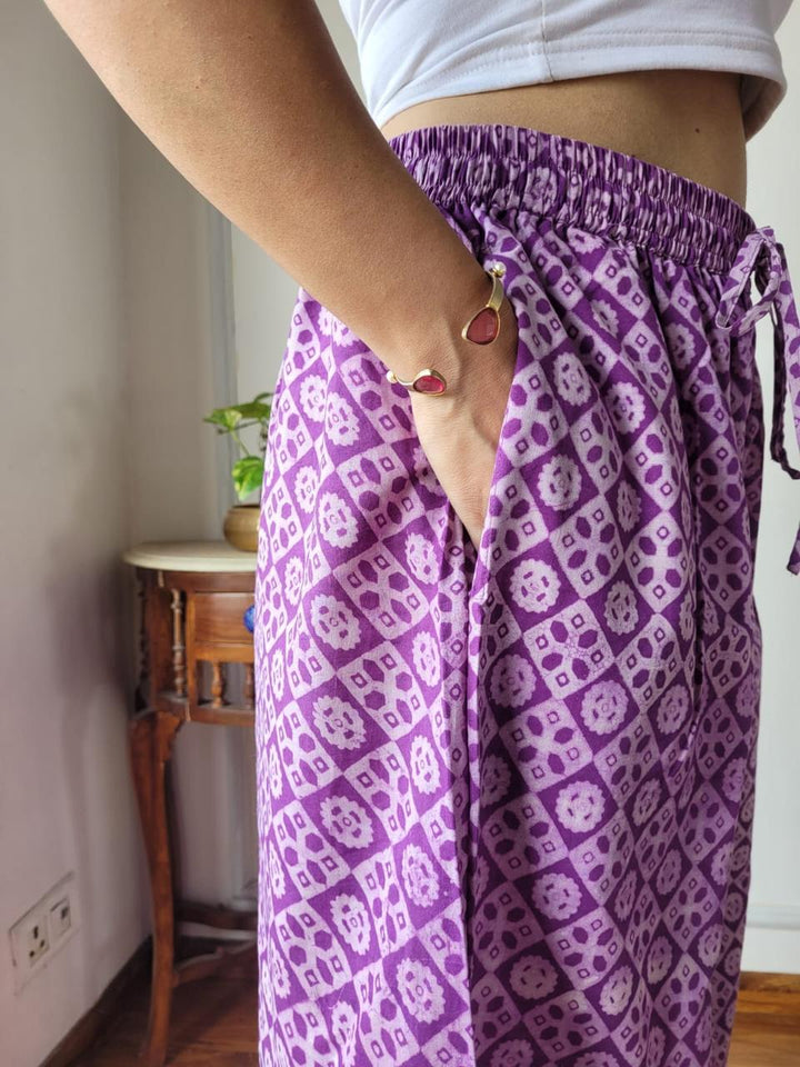- Purple Cotton bagru hand block print palazzo with pockets.