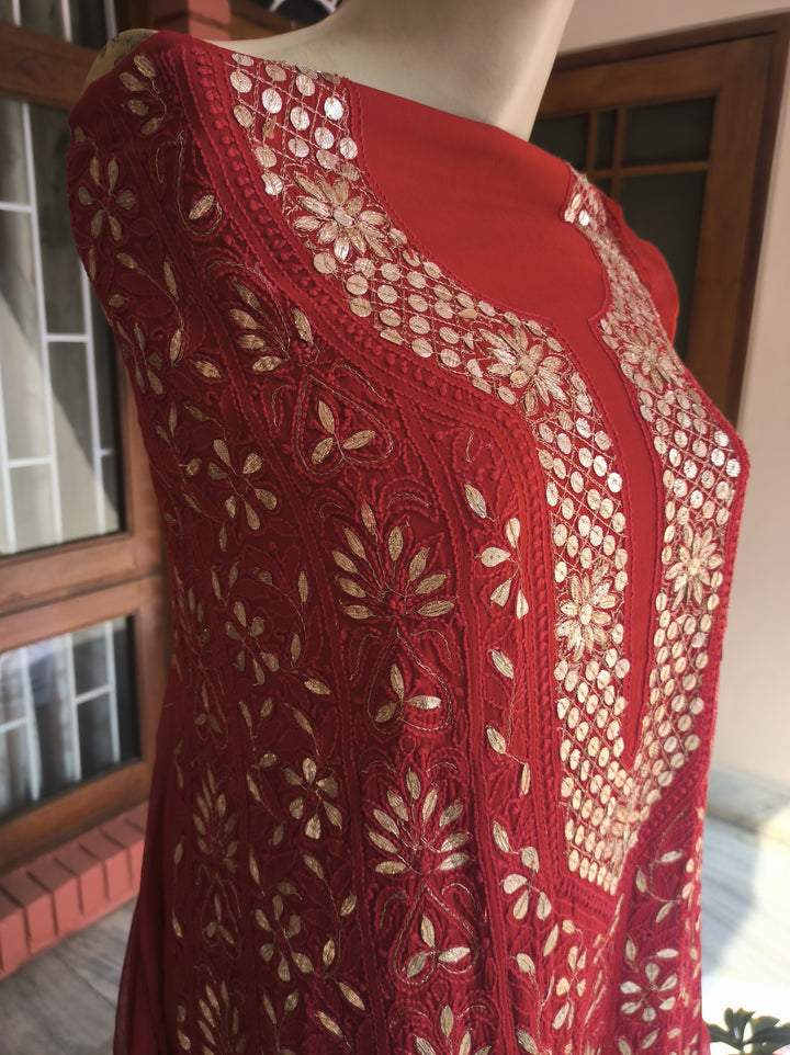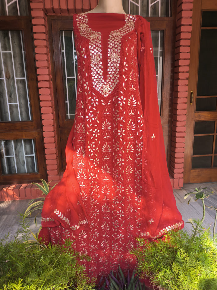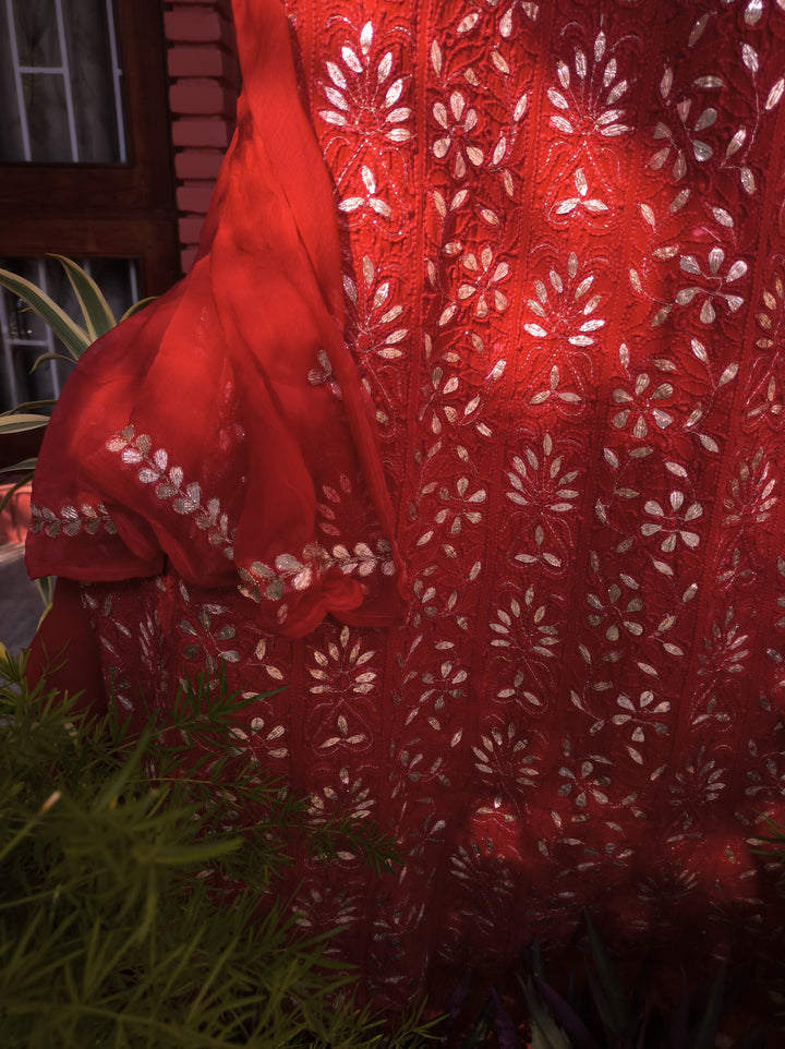 “Surkhina” Red Lucknowi Chikankari Gota Patti Salwar Suit(Dress Material)