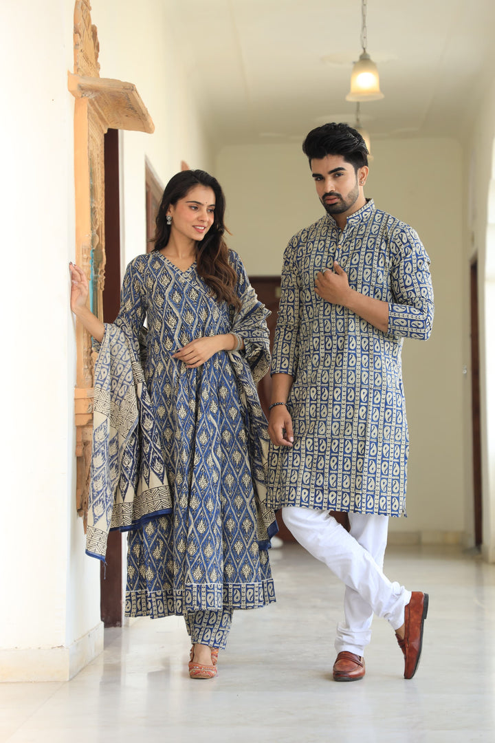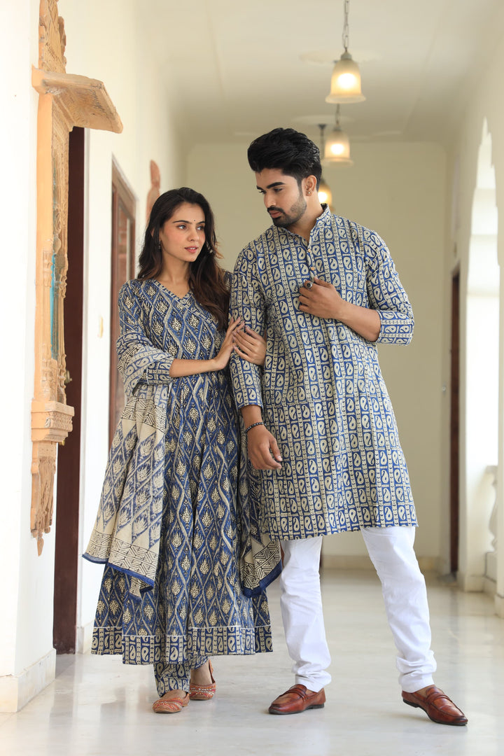 Blue Bagru Block Printed Pure Cotton Twinning Couple Set