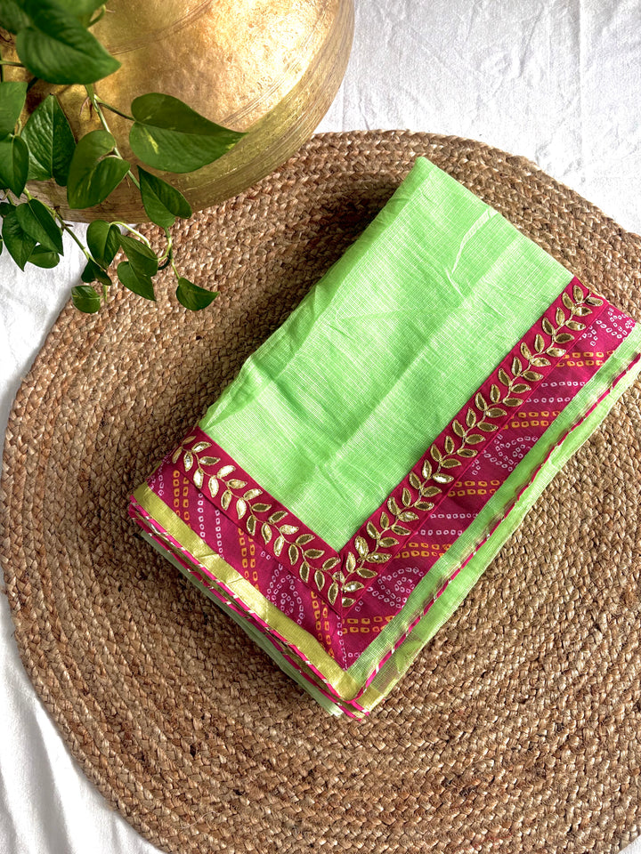 Green colour Kota Doria Gota Patti Saree Comes With Blouse. The Saree Comes With Designer Gota Patti Work On Border And Boota. Wear This Kota Doria Saree as Casual Meeting Saree Or Kitty Party Saree. Saree Length - 6.5 Mtr With Blouse.