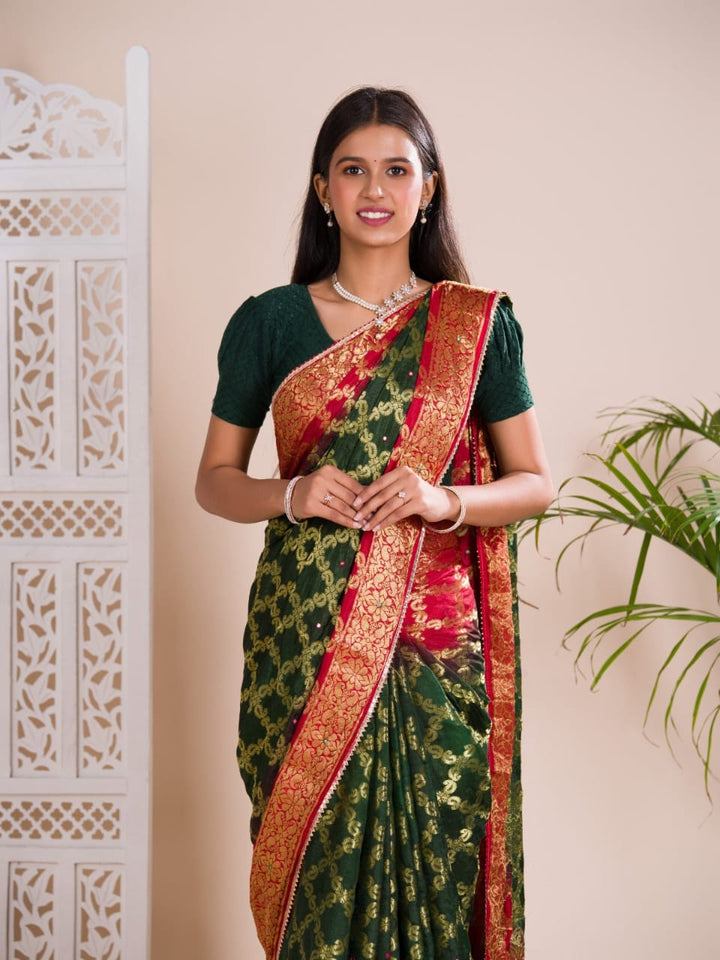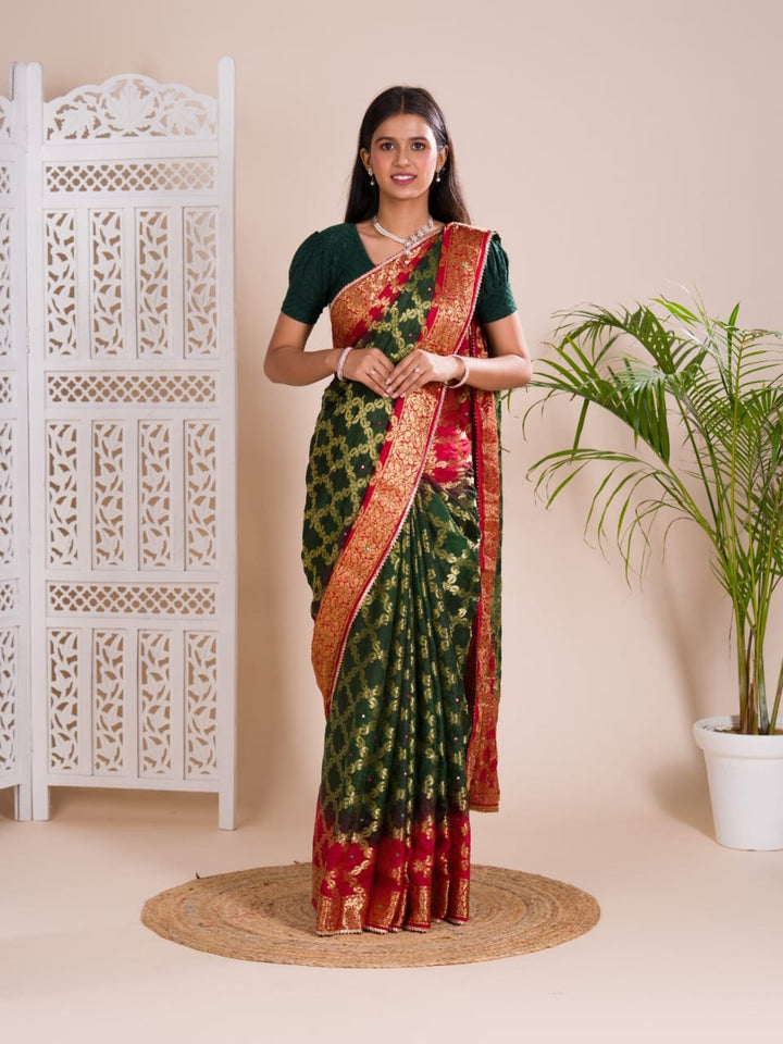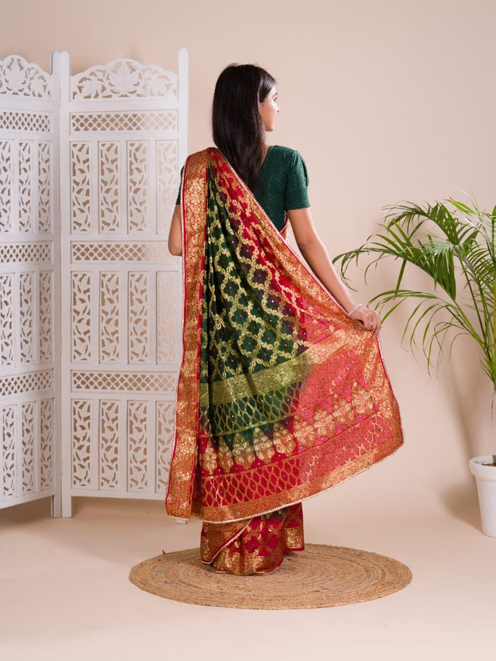 Green & Red Ghatchola Banarasee Silk Hand Mirror Work Saree