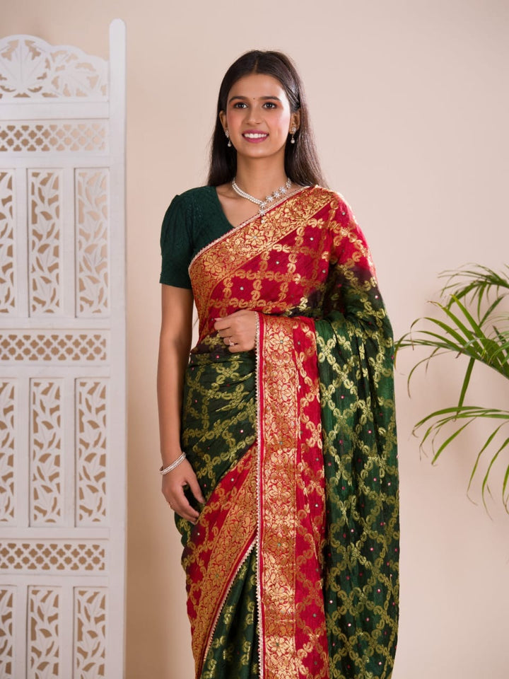 Ghatchola Banarasi Silk Saree In Green and red.This Fancy Ghatchola Silk Saree Is Full Weaved With Zari Check With Hand Mirror Work. This Saree Pattern With Baandhani Boota On Whole Saree As Shown In The Pic. The Saree Comes With Running Silk Blouce Same As Saree Color. Saree Is 6.5 Mtr Long With BlouceLength - Saree Length is standard 6.5 mtr with blouse.