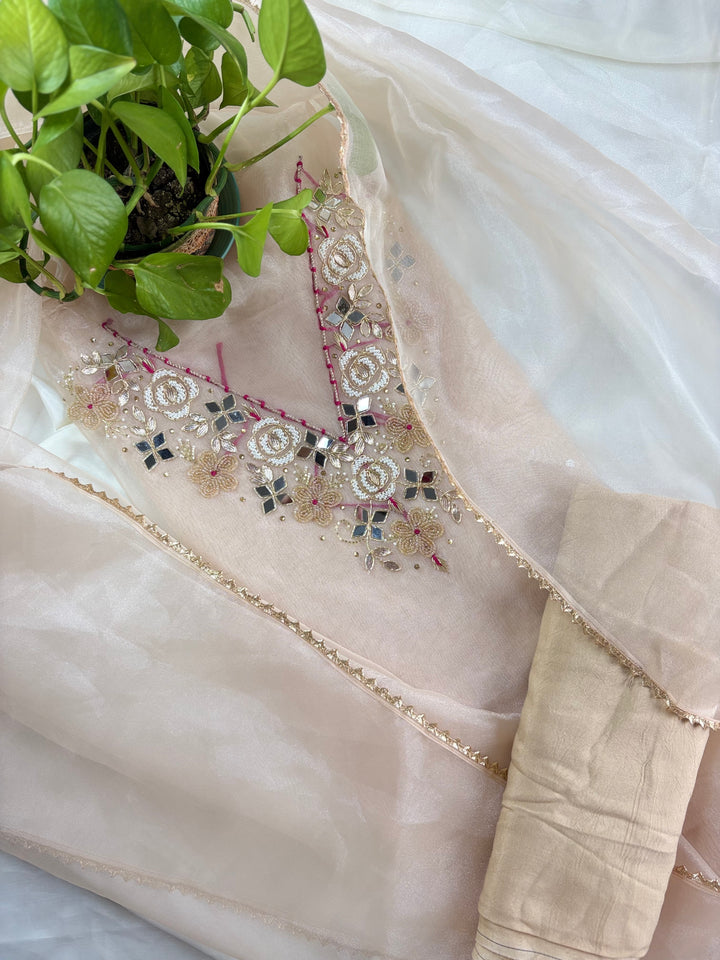 Oorja- Off White Organza Suit With Heavy Pearl Neck Work