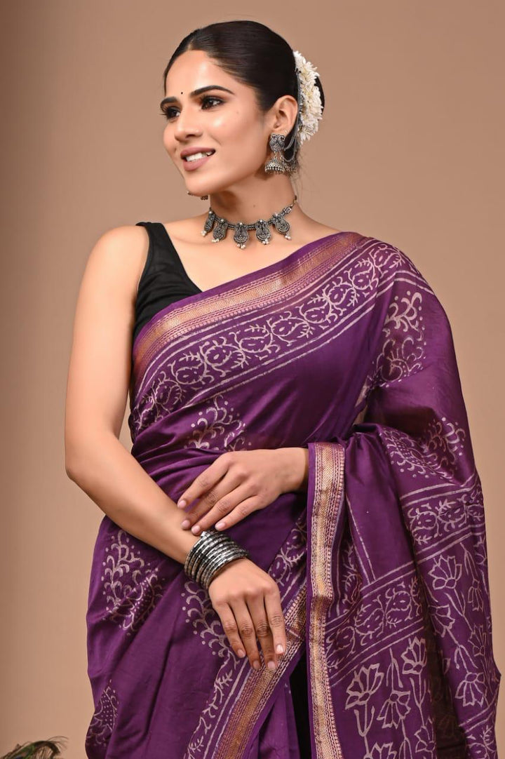 Purple Maheshwari Silk Bagru Hand Block Print Saree
