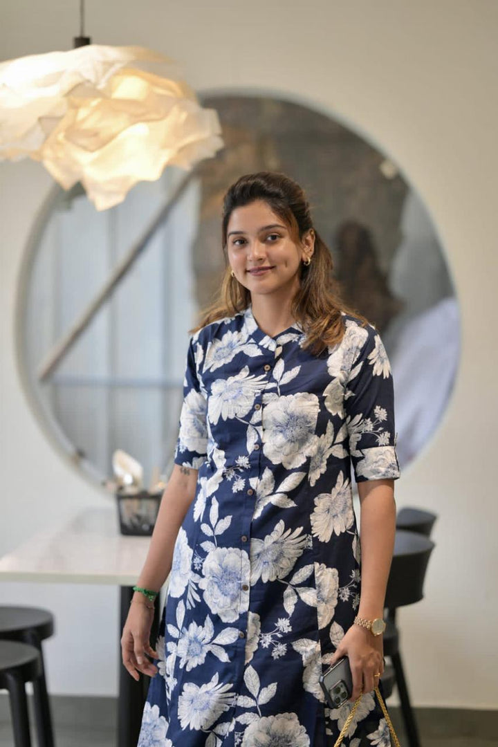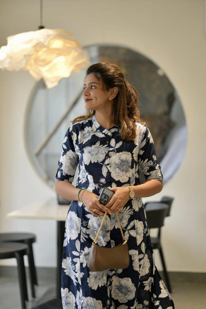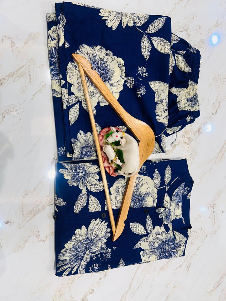 • Ink Blue printed Cotton Designer Kurti Pant Co-ord Set