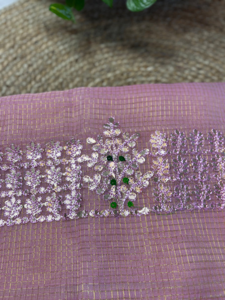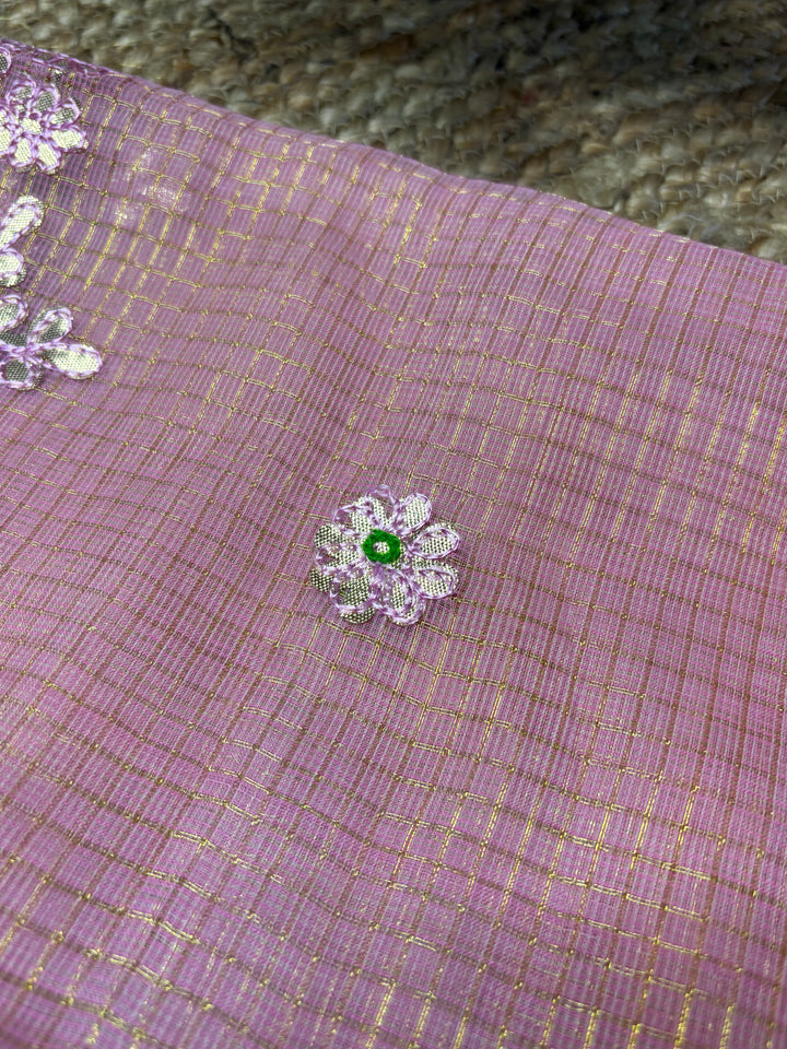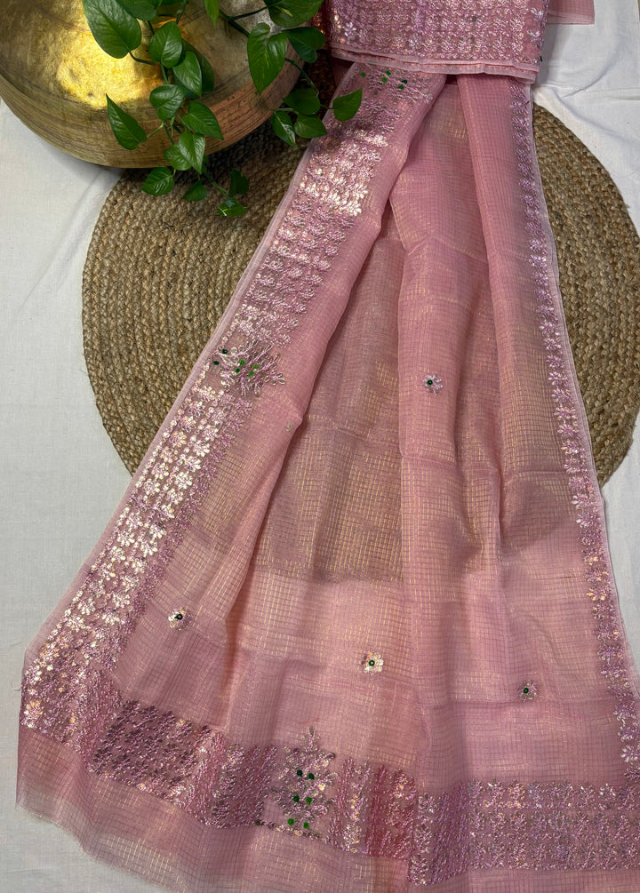 Light pink Kota Doria Gota Patti Saree Comes With Blouse. The Saree Comes With Designer Gota Patti Work On Border And Boota. Wear This Kota Doria Saree as Casual Meeting Saree Or Kitty Party Saree. Saree Length - 6.5 Mtr With Blouse.