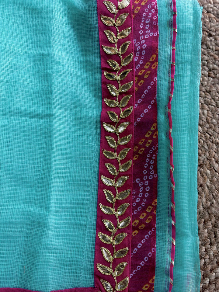 Sea Green Kota Doria Gota Patti Saree Comes With Blouse. The Saree Comes With Designer Gota Patti Work On Border And Boota. Wear This Kota Doria Saree as Casual Meeting Saree Or Kitty Party Saree. Saree Length - 6.5 Mtr With Blouse.