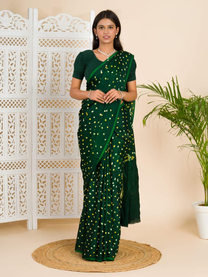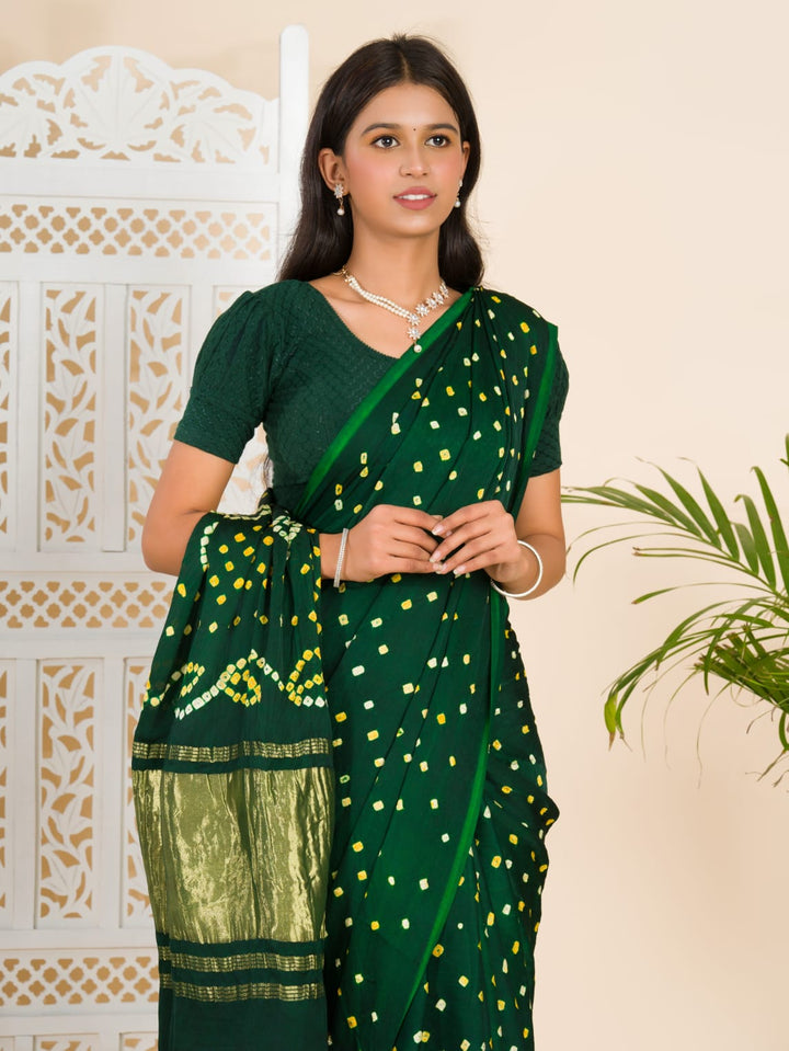 Green Model Gaji Silk Saree in dot work style Are Always In Fashion With Their Royal Look, This green Silk Saree Will Make Your Look Flawless On Any Of Your Special Occasion. The Soft fabric Add A Touch Of Elegance. This Bandhani Silk Saree Features Beautiful Single Dot Work All Over.