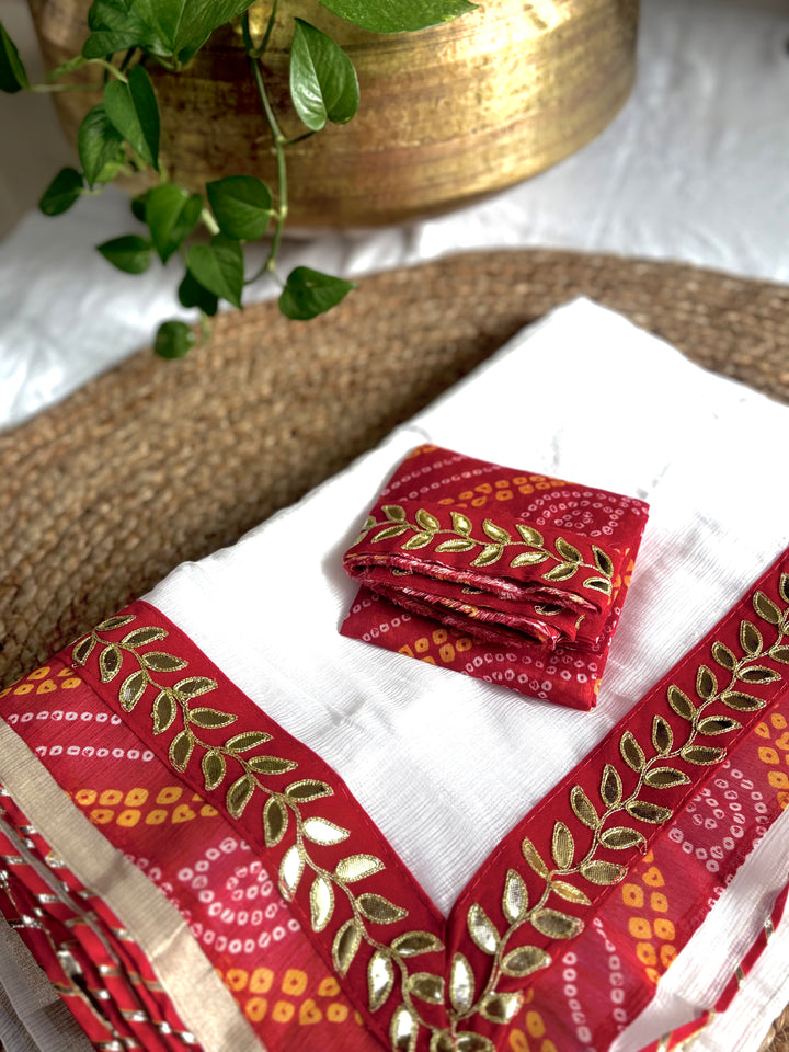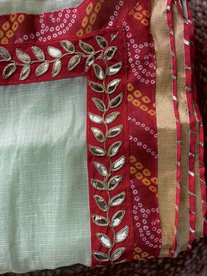 White Kota Doria Gota Patti Saree Comes With Blouse. The Saree Comes With Designer Gota Patti Work On Border And Boota. Wear This Kota Doria Saree as Casual Meeting Saree Or Kitty Party Saree. Saree Length - 6.5 Mtr With Blouse.