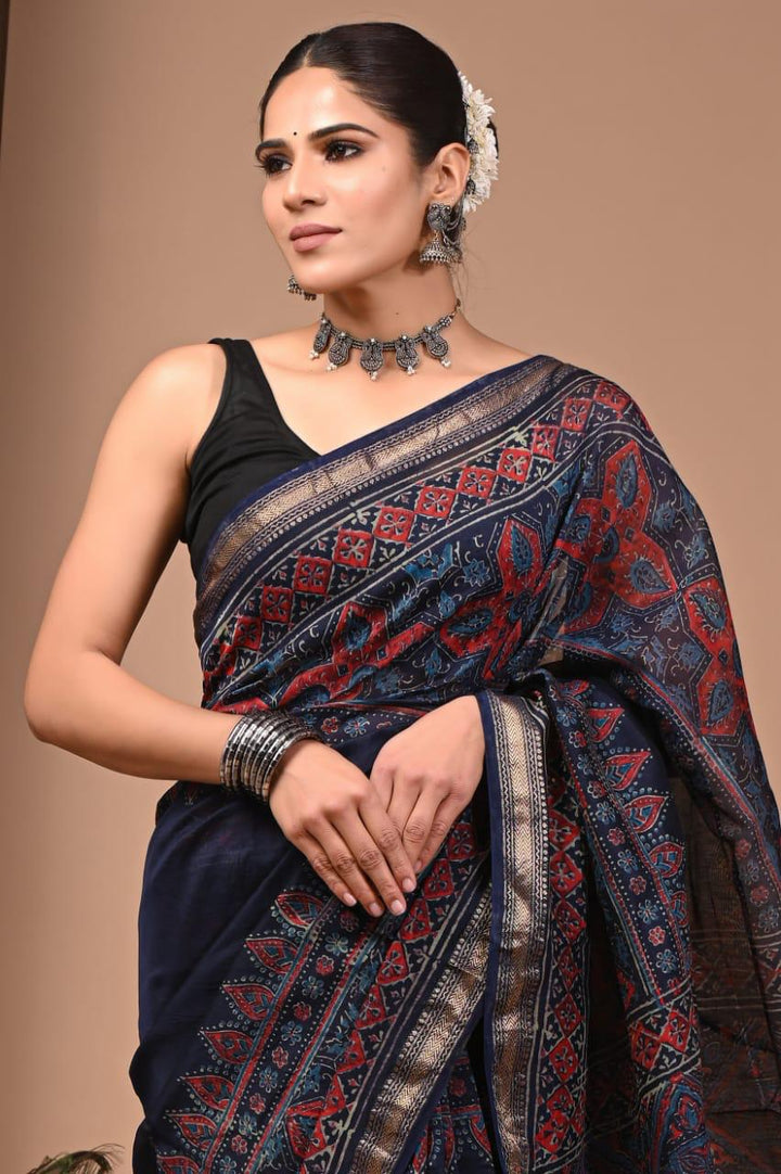 Blue Maheshwari Silk Bagru Hand Block Print Saree