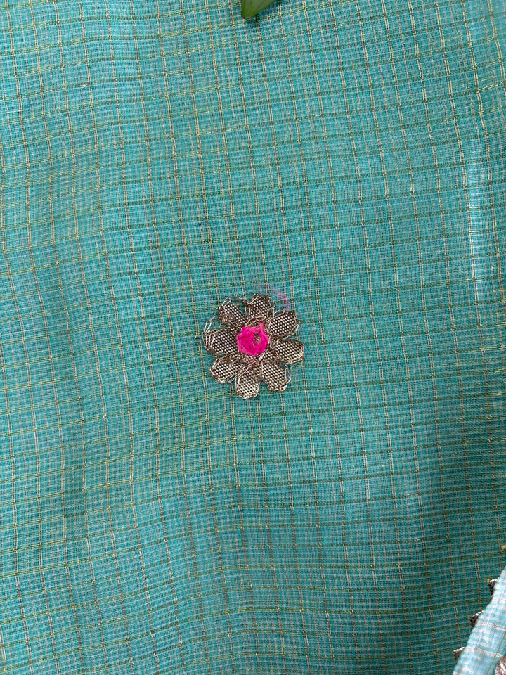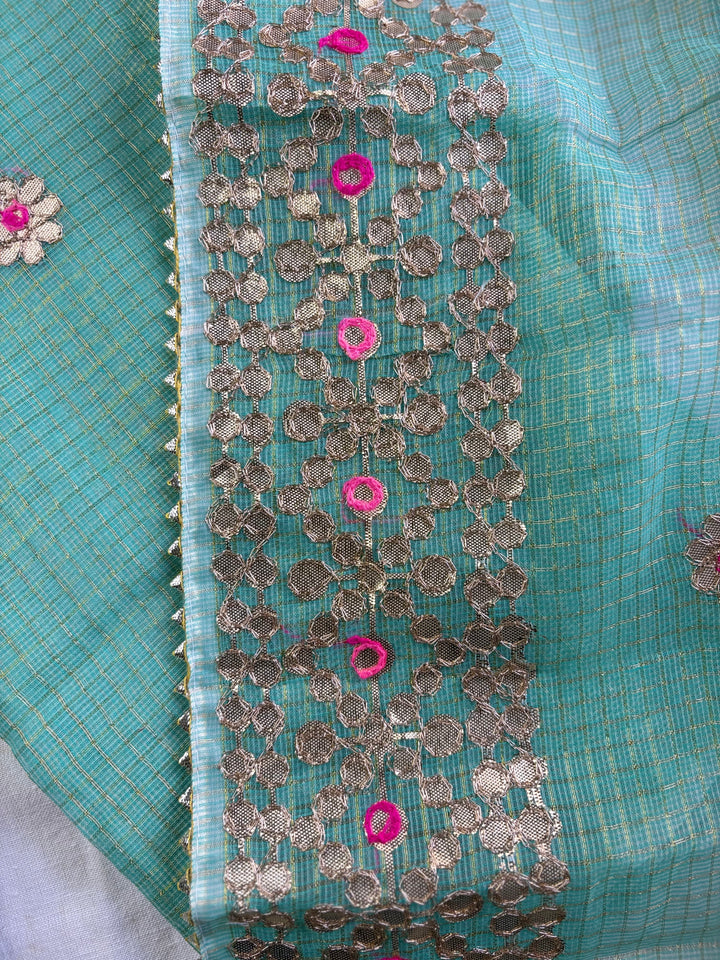 Kota Salwar Suit In Gota Work In green, This Traditional Suits 2.5 Mtr Top In Kota ,2.5 Mtr Dupatta In Kota,2.5 Mtr Bottom In Cotton, Wear This Kota Doria Suit With Kundan Necklace And Jhumkas On Day Time Function, This Designer Suit Comes With Beautiful Dupatta That Seems Perfect For Any Occasion,Free Shipping And Cod Available, Shipping Worldwide.