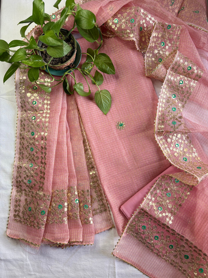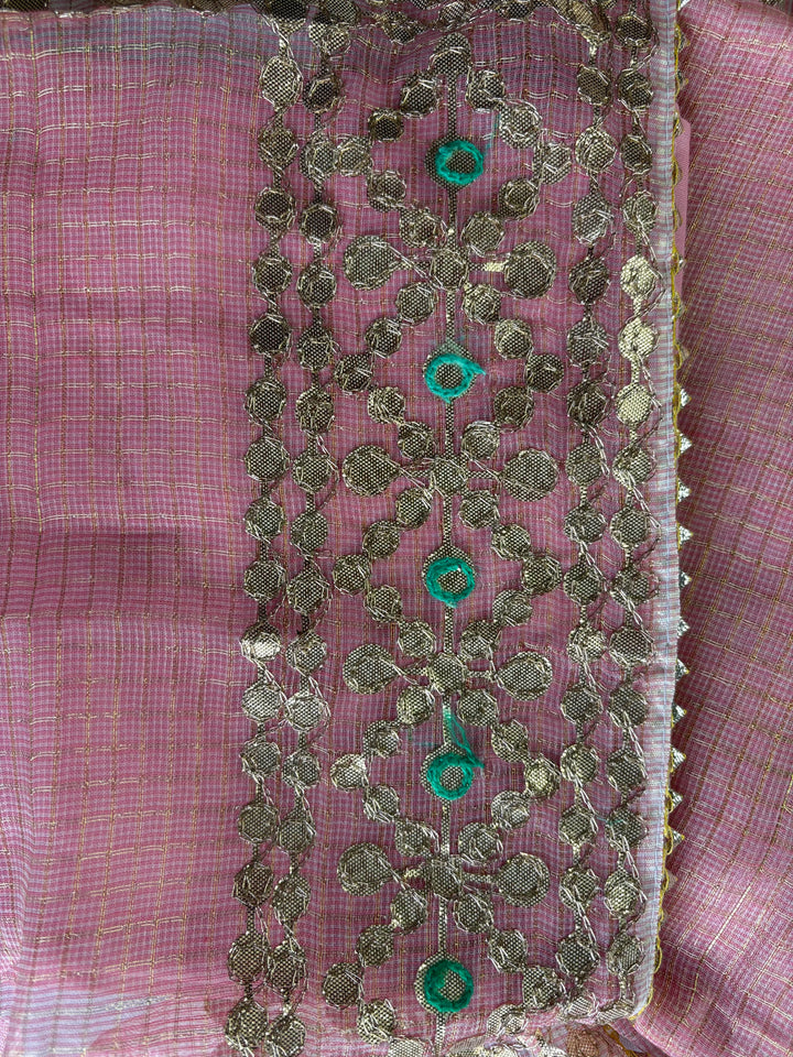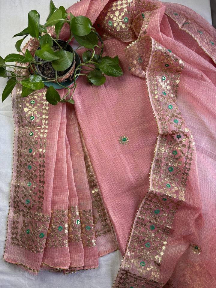 Kota Salwar Suit In Gota Work In pink, This Traditional Suits 2.5 Mtr Top In Kota ,2.5 Mtr Dupatta In Kota,2.5 Mtr Bottom In Cotton, Wear This Kota Doria Suit With Kundan Necklace And Jhumkas On Day Time Function, This Designer Suit Comes With Beautiful Dupatta That Seems Perfect For Any Occasion,Free Shipping And Cod Available, Shipping Worldwide.