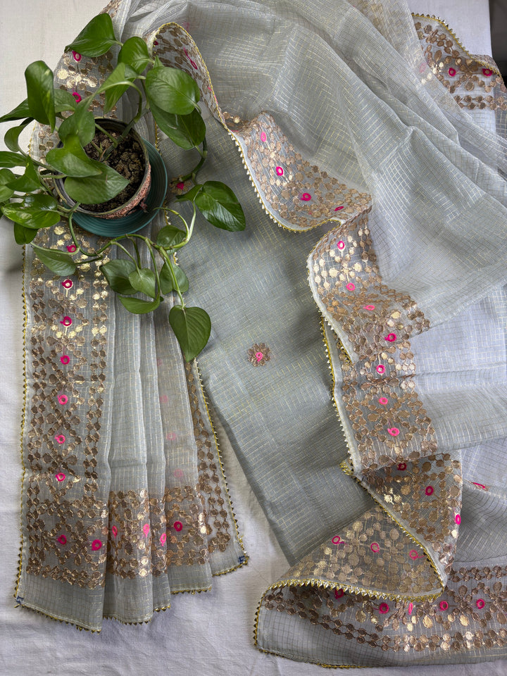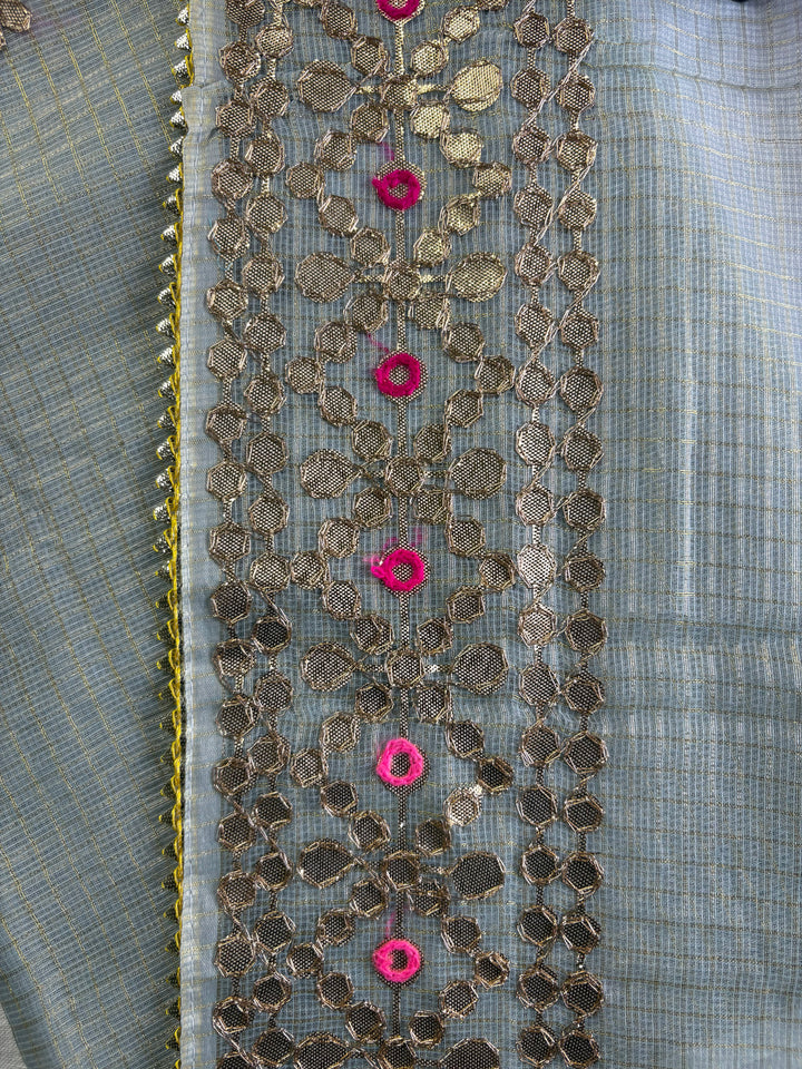 Kota Salwar Suit In Gota Work In grey, This Traditional Suits 2.5 Mtr Top In Kota ,2.5 Mtr Dupatta In Kota,2.5 Mtr Bottom In Cotton, Wear This Kota Doria Suit With Kundan Necklace And Jhumkas On Day Time Function, This Designer Suit Comes With Beautiful Dupatta That Seems Perfect For Any Occasion,Free Shipping And Cod Available, Shipping Worldwide.